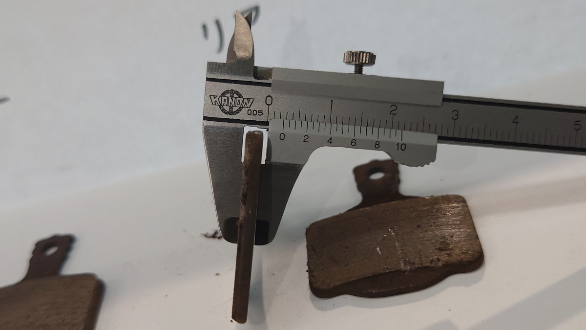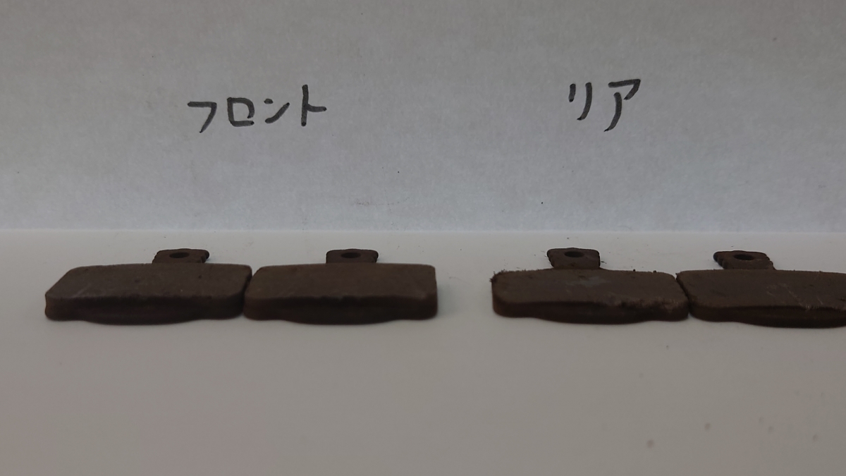 前後の残量が明らかに違いますね(※フロントのパッド残量が有る事をお伝えしたうえで、お客様の希望で前後とも交換しています)