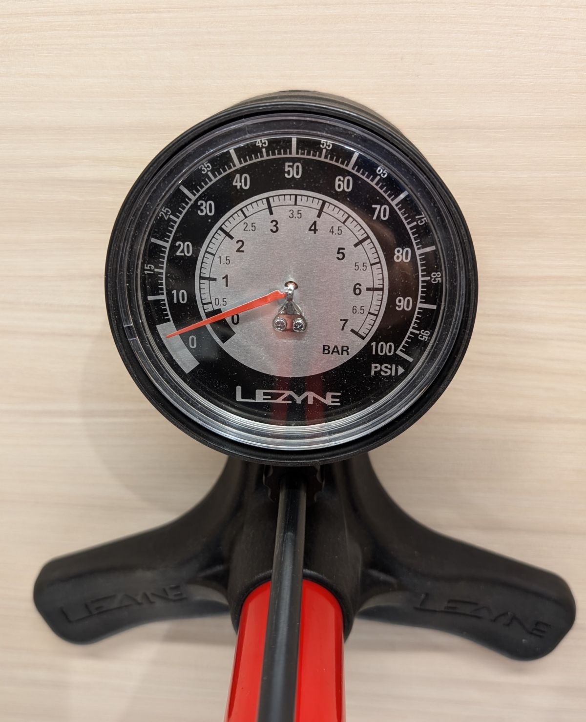 商品名の「GRAVEL」にあるとおりMTBやグラベル系タイヤに対応したポンプです。ハイプレッシャータイプのSPORT FLOOR DRIVEと性能を簡単に比較すると最大空気圧が低圧になり、仏式バルブ専用ヘッド、1ストロークで入る空気量は29%向上しています。