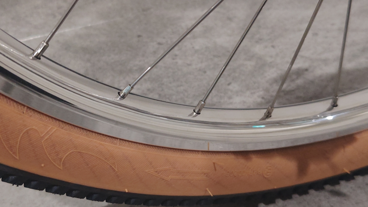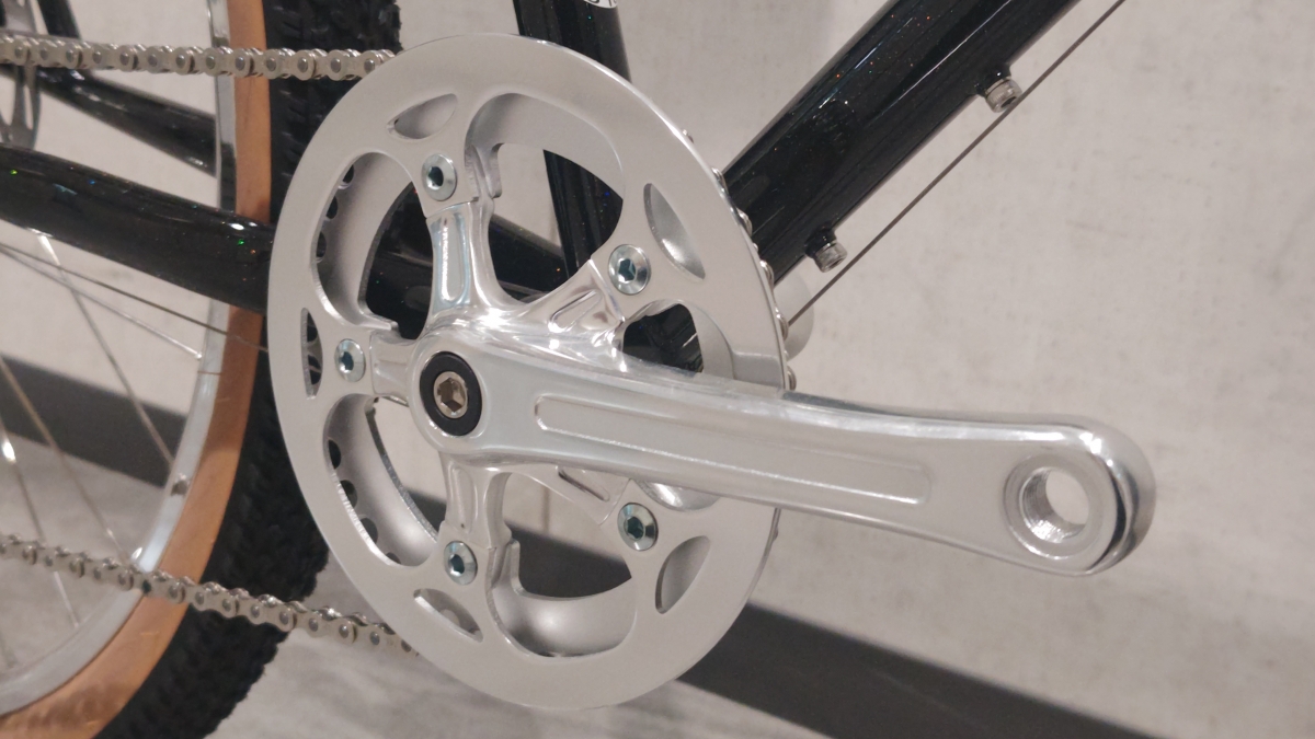 ホイールのリムからクランク、ハンドル周りはクラシック感のあるポリッシュシルバーなパーツ類でまとめられ、ブラウンサイドのブロックタイヤが良い感じにまとまっています。もう少し薄めのクリーム系のタイヤでもよさげです。