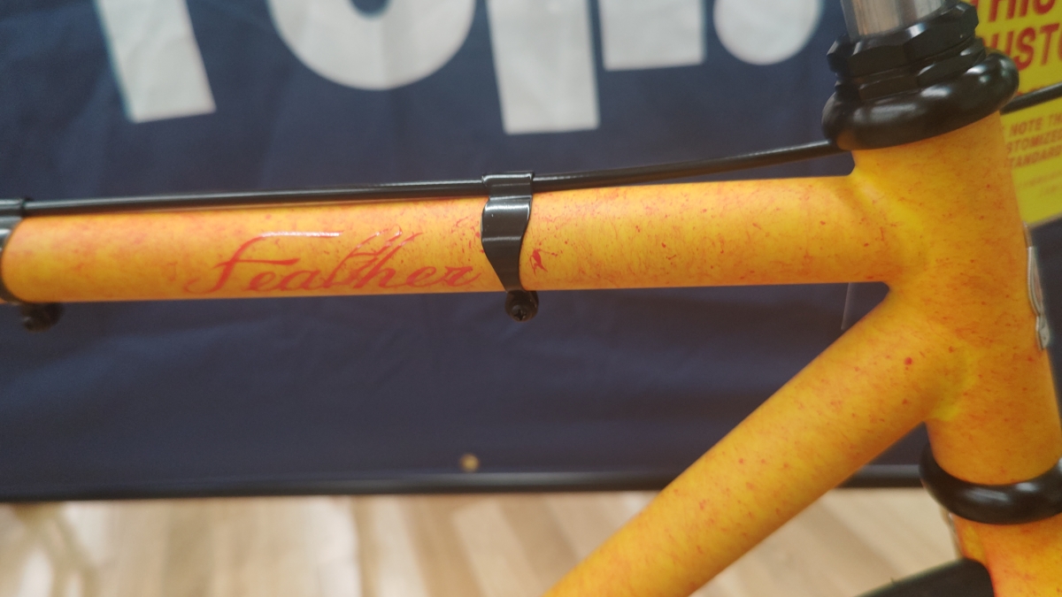 昨年での展示会で一番目を惹いたスプラッシュ系のカラーリング。イエローをベースに赤色のペイントが全体に施された色なので、遠目にはオレンジっぽくも見えそうです。