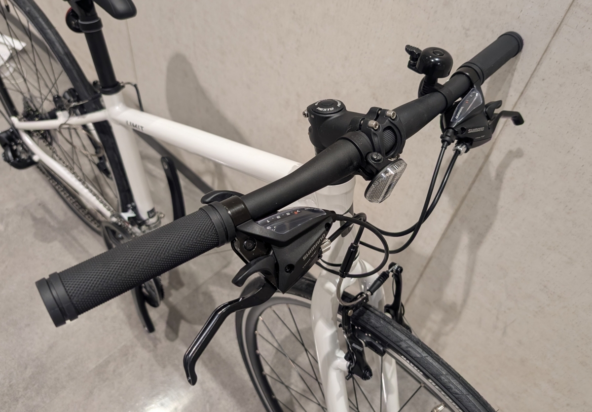 ハンドル幅は全サイズ560mm、ステムは380サイズ60mm、440サイズ80mm、500サイズ100mmとサイズによって長さが最適化されています。レバーはシマノの変速とブレーキが一体になったタイプが採用されています。グリップはスタンダードな丸形です。長い時間乗車する使い方だとエルゴグリップに交換しても良いかと思います。