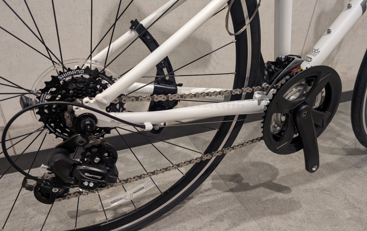 IMG_20250423_140157[1]ギヤ構成はフロントチェーンリング48x38x28のトリプル、リヤスプロケットは12-32Tの7速、全21段変速です。ワイドなギヤ構成なので様々なシチュエーションで走行性能を発揮してくれます。ブレーキはシマノのVブレーキが採用されているのでブレーキ本体の剛性もあり、カッチリとしたブレーキフィーリングです。タイヤサイズは700x28cとクロスバイクでは細めな幅ですね。ちなみにリヤホイールはOLDが130mmなのでロードバイクのホイールが装着可能です!