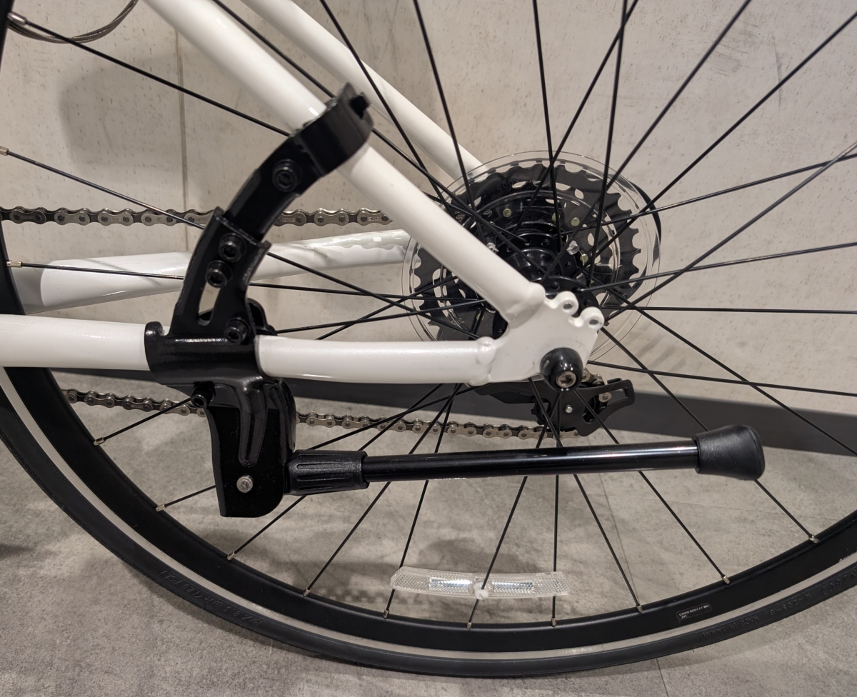 NESTOはKHODAABLOOM同様キックスタンドが標準装備されています。クロスバイクだとほぼマストな装備なのでありがたいですね。画像のホイール固定部分を見ると6角レンチで固定するタイプになっていますね。固定力が強いので、工具は必要ですがプラス要素です。