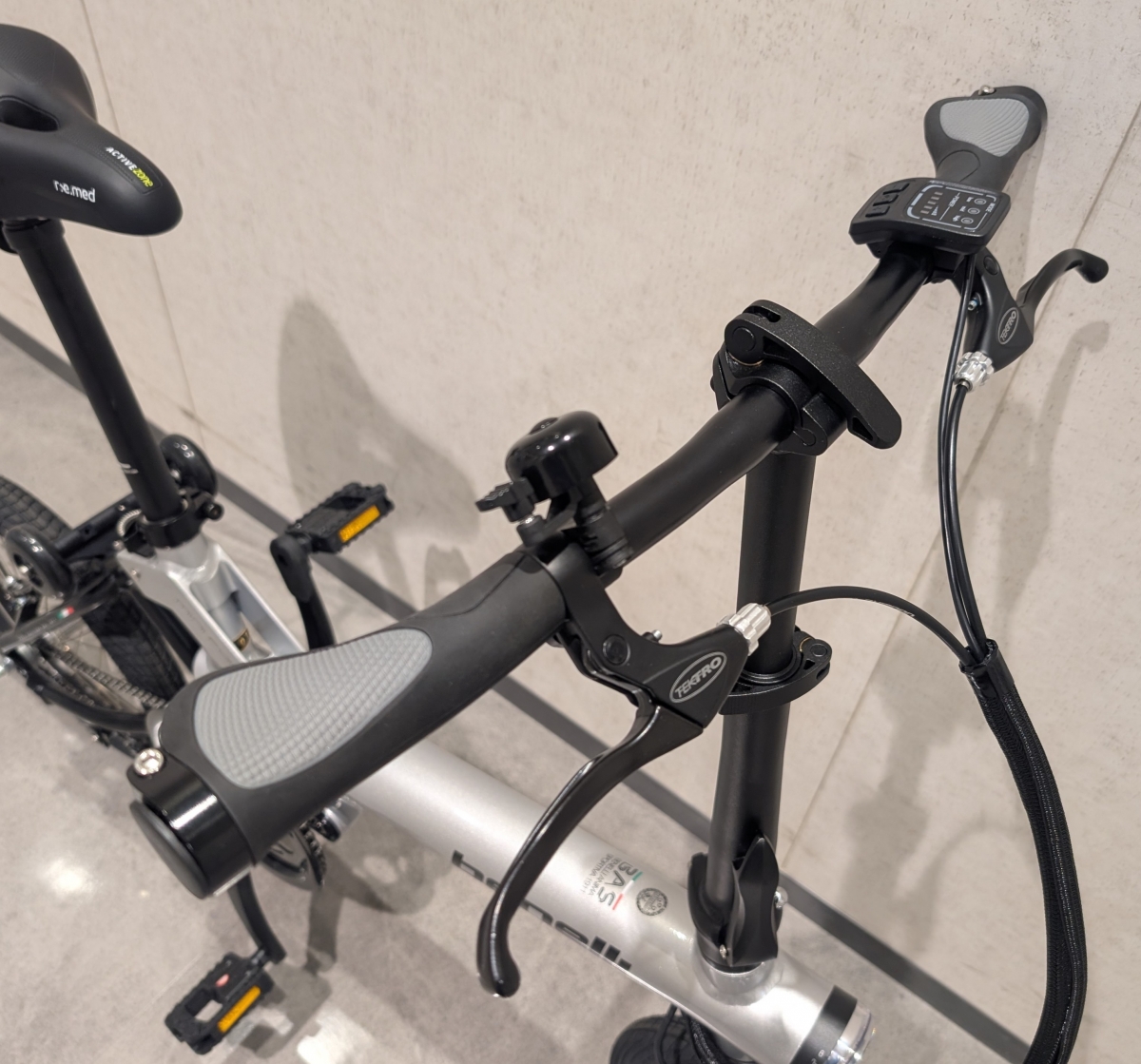 高さ調整ができる折り畳みステムにストレートハンドル、グリップはエルゴグリップが採用されています。ギヤはシングルなのでハンドルにはブレーキレバーとコントロールパネル、ベルとシンプルです。