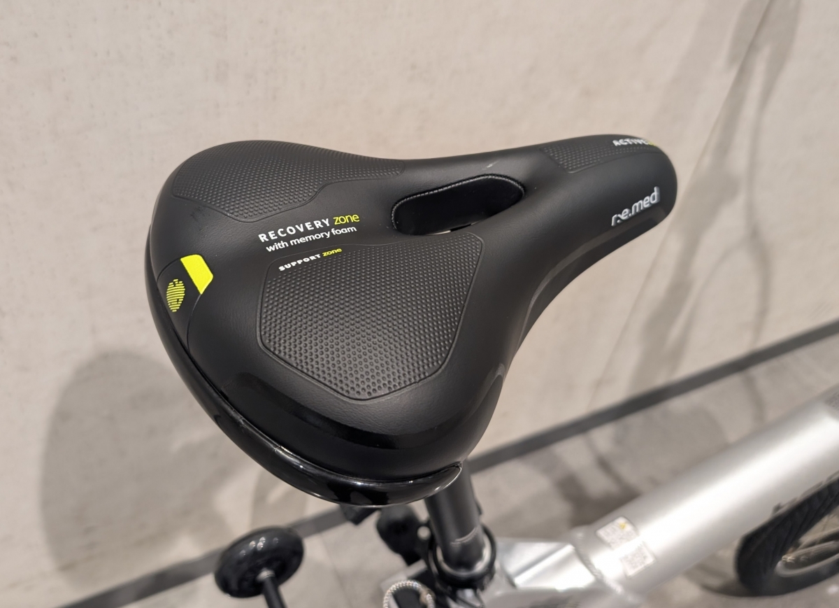みたままに快適性重視の分厚いサドルです。実際に座るとフカフカでお尻に優しい感じです。スタイリッシュな見た目ですが、グリップやサドルはエルゴノミックなパーツがアセンブルされていますね。