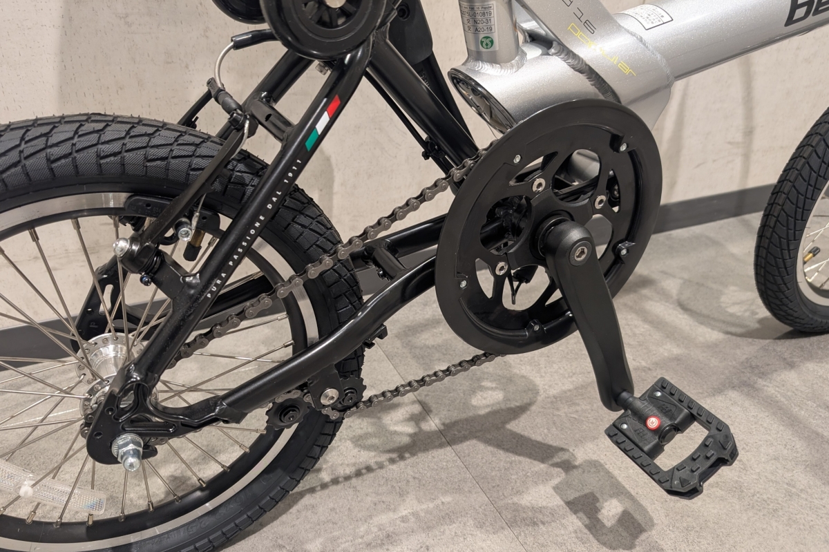 MINI FOLD 16 POPULARは52x12Tのシングル仕様になります。タイヤサイズは16インチのタイヤサイズに2.25インチ幅を採用しています。最大航続距離はLOWモード50km、HIGHモード38km(使用状況で走行距離は短くなる場合がございます)で、他のE-BIKEと比べると短めなので使用目的としては近場の移動が適しているようです。