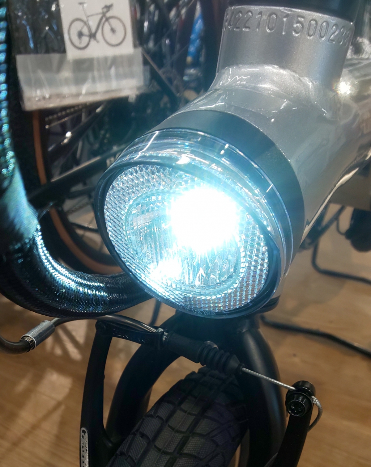フレームの前側の先端がライトになってます。点灯の仕方はコントロールパネルの「+」ボタンを長押しです。