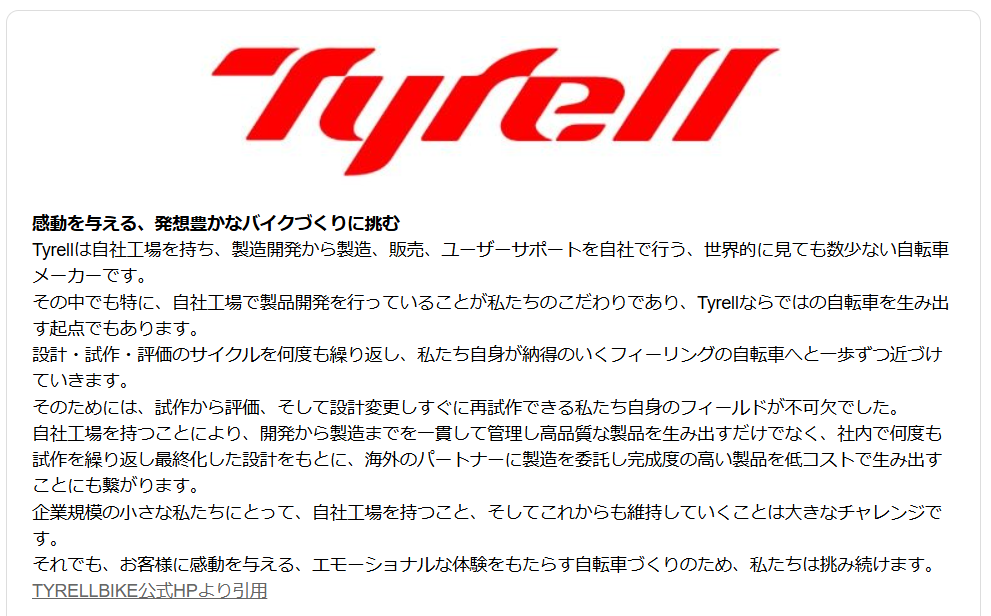 TYRELLは香川県さぬき市に本拠を置く2004年創業の比較的新しいブランド。創業者が自分で欲しい自転車をつくろうとしたところから始まった異色な生い立ちを持つブランドです。折り畳み方法も少し特殊なので頻繁に折り畳んで使うというよりは、旅先・出先でサイクリングを楽しみたいという方にオススメしたいブランドです。