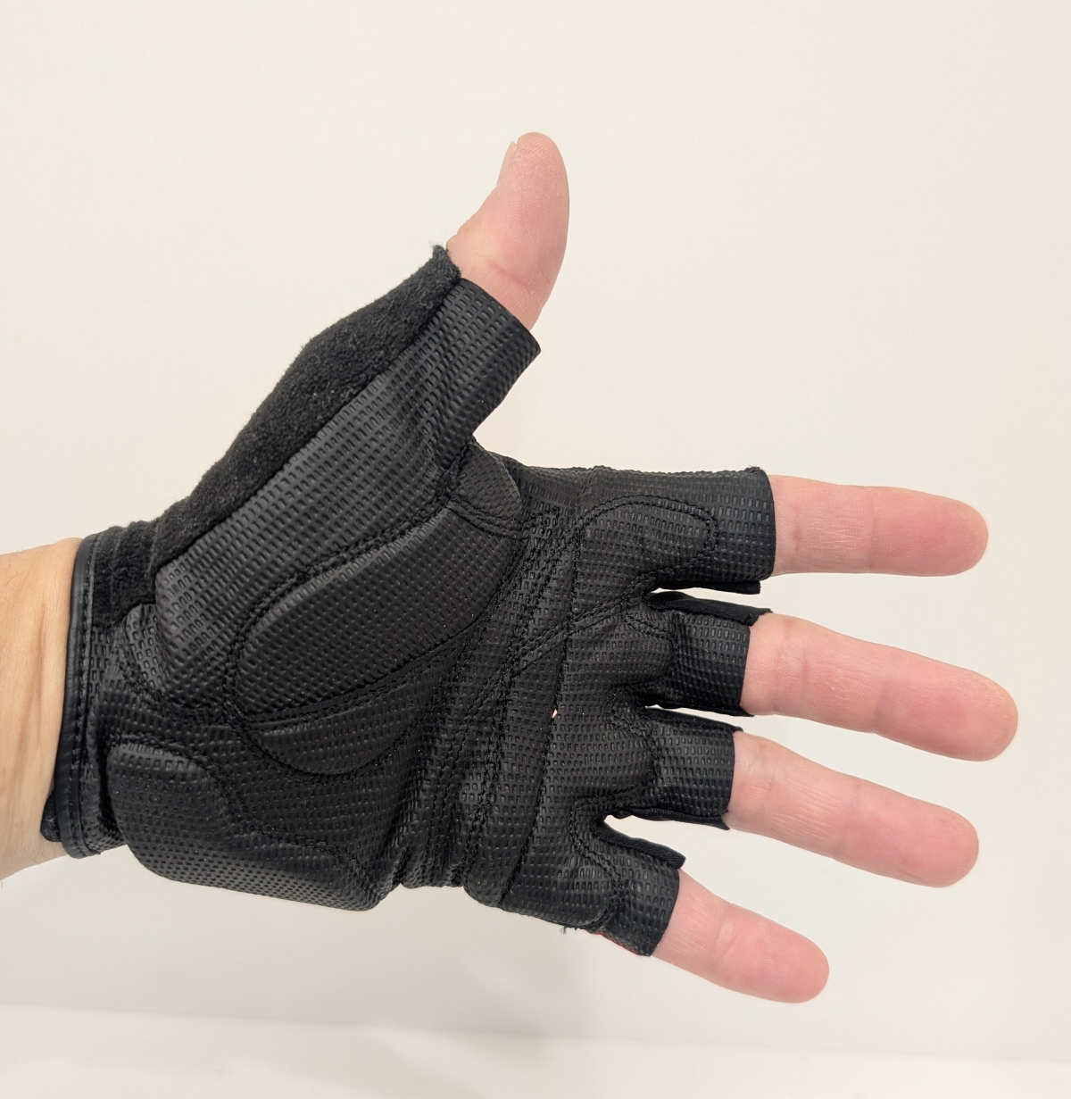 手の甲側は伸縮性のある吸汗速乾素材を使用、YS-03は手の平側がゴム質の素材を配置していてグリップ力は強いです。ちなみにYS-04は薄めの皮のような素材を手の平側に採用しています。さてYS-03は手の平側に厚めのパッドがグリップの接触部分にあるので振動などを軽減してくれます。親指の付け根部分は汗を拭う素材になっています。