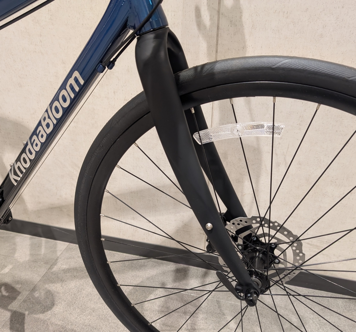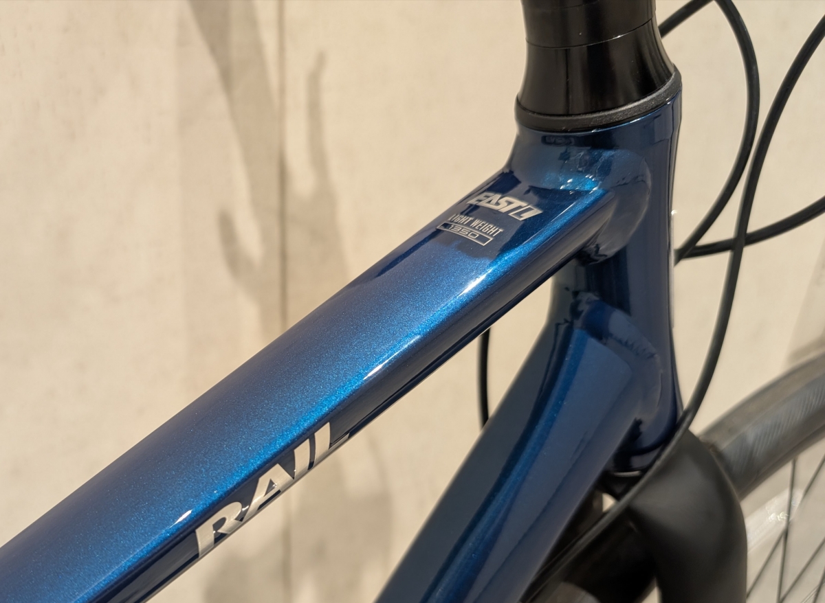 フレームは前半分がメタリックブルー、後ろ半分がグラデーションでブラックにカラーリングされています。落ち着いた雰囲気ですね。フロントフォークはカーボン、軽量で振動減衰性に優れています。一般的なクロスバイクは金属フォークを採用しているのでRAIL DISC EXがRAILシリーズの上位車体とおわかり頂けるかと思います!車体重量10.3kgは伊達じゃない!