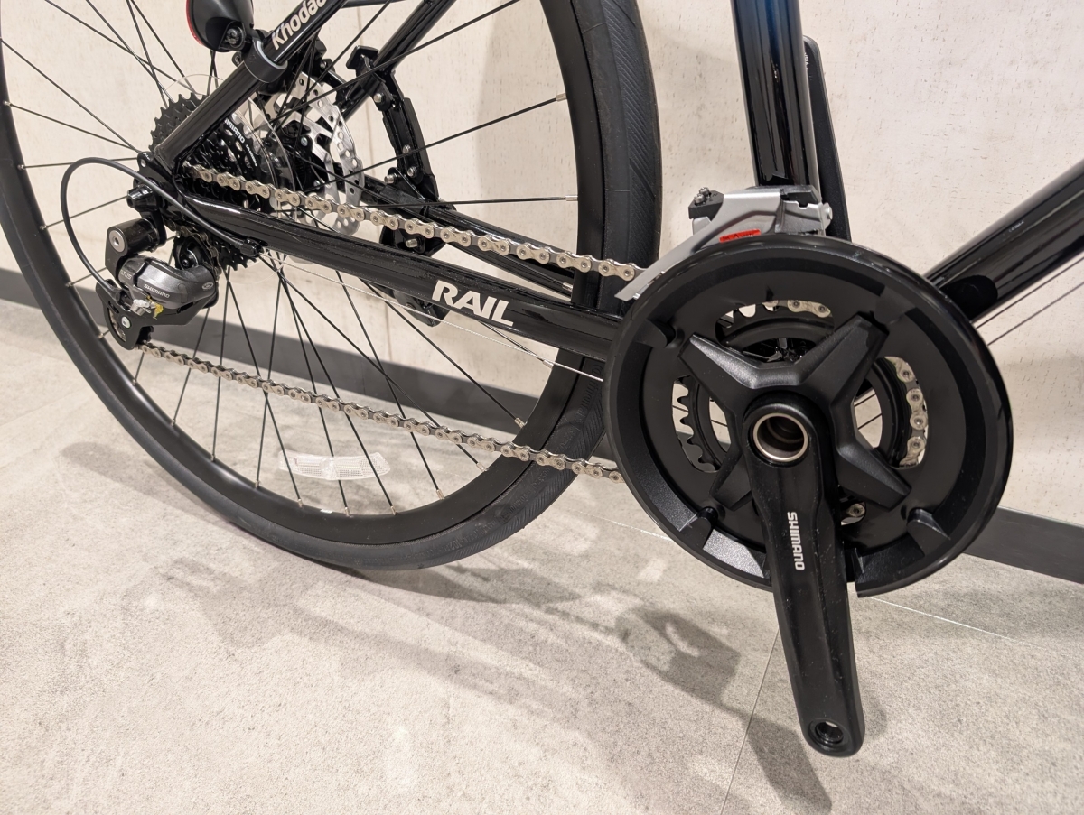 フロントチェーンリング46x30T、リヤスプロケット11-32Tの9速、全18段変速です。クランクはシマノの剛性の高い2ピース構造のタイプでチェーンリングガード付きです。クランクの剛性が高いので踏んだ力が効率よく推進力に変わります!タイヤはCONTINENTAL ULTRA SPORT2の700x32cとなっております。