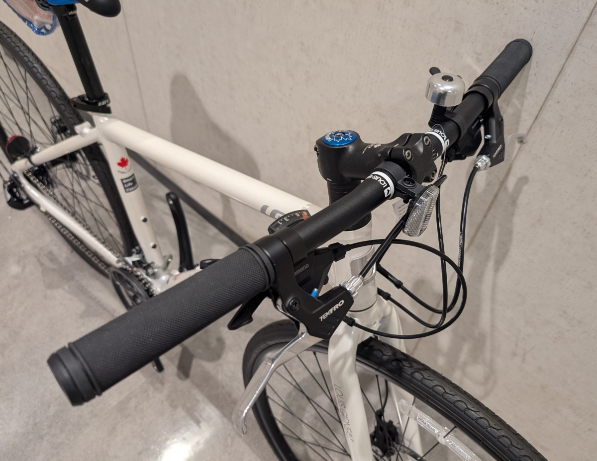 ハンドルとステムは「LOUIS GARNEAU」のロゴ入りです!角度が付いており上向きになっているので、逆向きにすれば落差のあるポジションをとる事も可能です。ハンドル幅は少し広めの580mm、ステムはハンドルクランプ径25.4mmで75mm長となっております。ブレーキレバーはテクトロ、シフトレバーはシマノになります。トップキャップがブルーなのはオシャレポイントです。