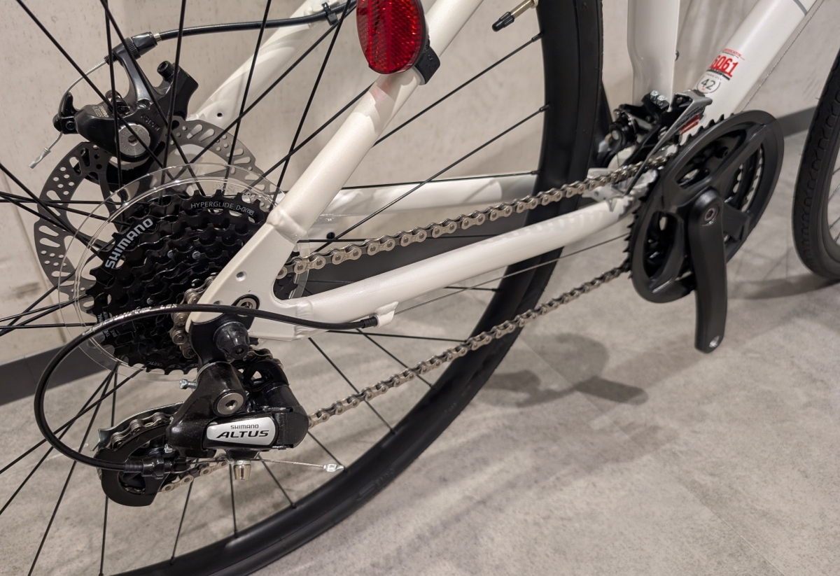 フロントチェーンリングは42-34-24Tのトリプル、リヤスプロケットは12-32Tの8速で、全24段変速です。ワイドなギヤ構成なので様々なシーンに対応しています!タイヤは700X28Cエアロや走行性能を意識した細めなタイヤが採用されています。