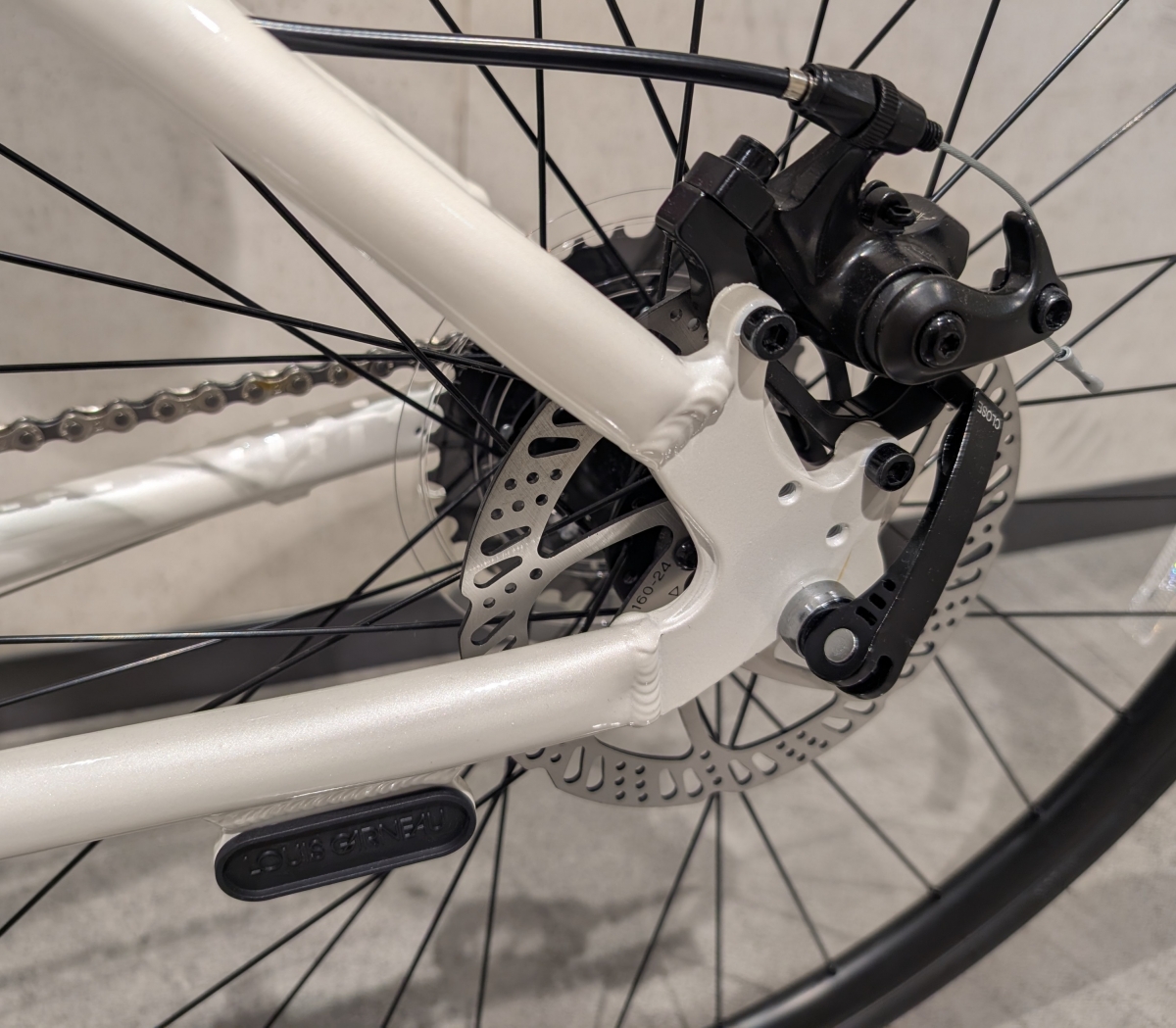ディスクブレーキキャリパーはテクトロ製で、メンテナンスのしやすいワイヤー引きタイプです 。細長い黒い樹脂パーツの部分はキックスタンドの取付ができ、穴の間隔が40mm幅のキックスタンドが取付け可能です。ただし、本体の取付け穴部分がテーパー状になっているので固定には皿ボルトが必須になります。規格は同じでも付属しているボルトが違うと正しく取り付けが出いない場合があります。純正スタンド(ルイガノ ダイレクトスタンド2))は皿ボルトが付属しているので安心です。