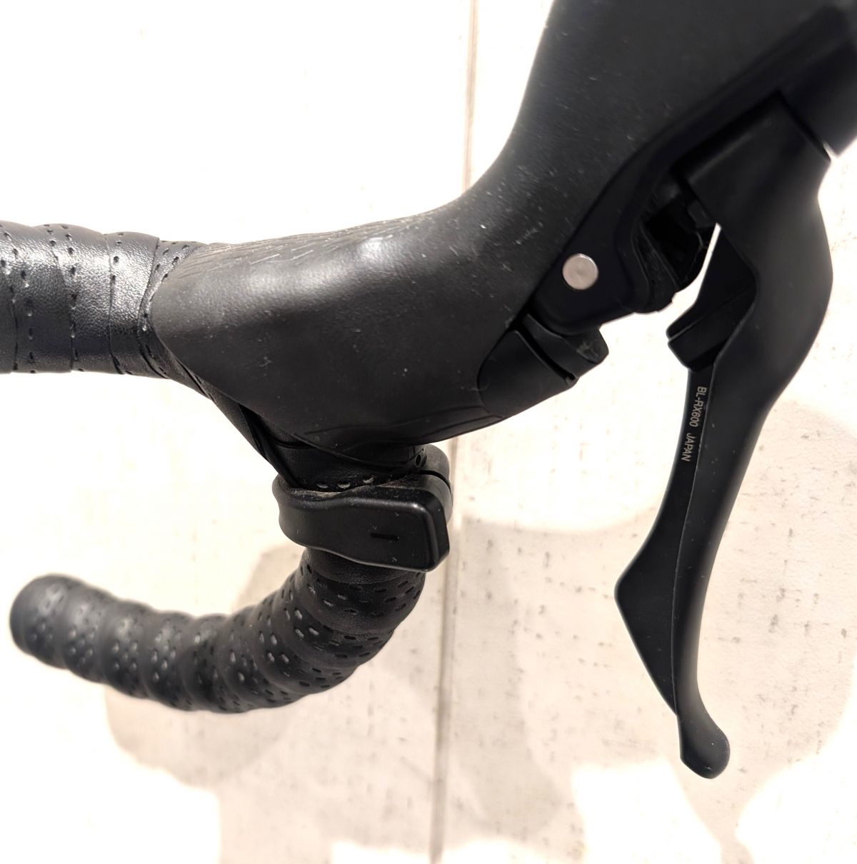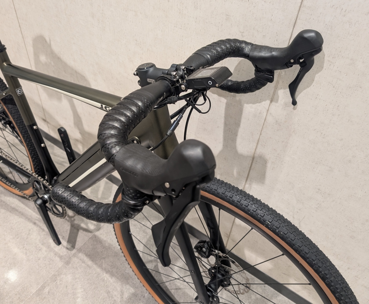 下側が開いた形状のフレアハンドルにシマノのグラベルコンポーネントのGRXを搭載。ハンドル中央部に小型ディスプレイ、STIの下にあるアシストコントロールスイッチでアシストモードを操作します。