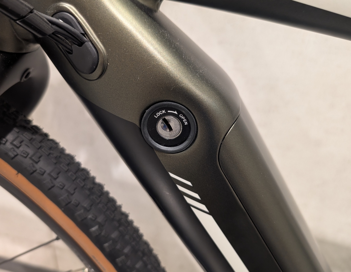 E-BIKEなのでバッテリーが搭載され、脱着には鍵を使用します。Jシリーズはバッテリーをダウンチューブに内装しており、ダウンチューブの左側にある鍵穴に専用キーを使用してカバーを開けるようになっています。しっかりとしたバッテリーの盗難対策がされています。