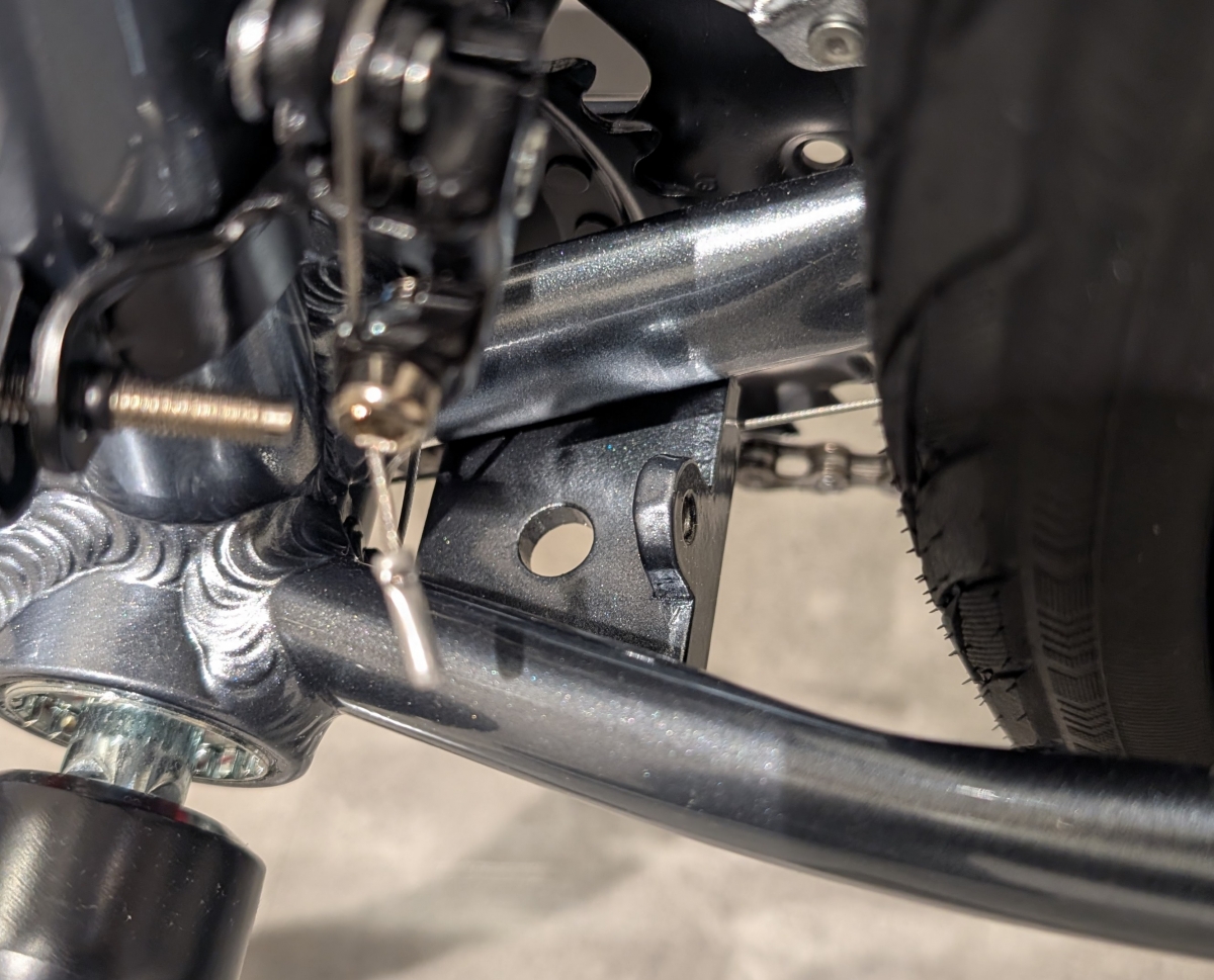 FUJIのクロスバイクにはついているプレート、センタースタンド台座も当然あります。ディスクキャリパーがないのでサイドスタンドでも大丈夫ですが、センタースタンドの方があまり目立たないので選ぶ方が多いです。