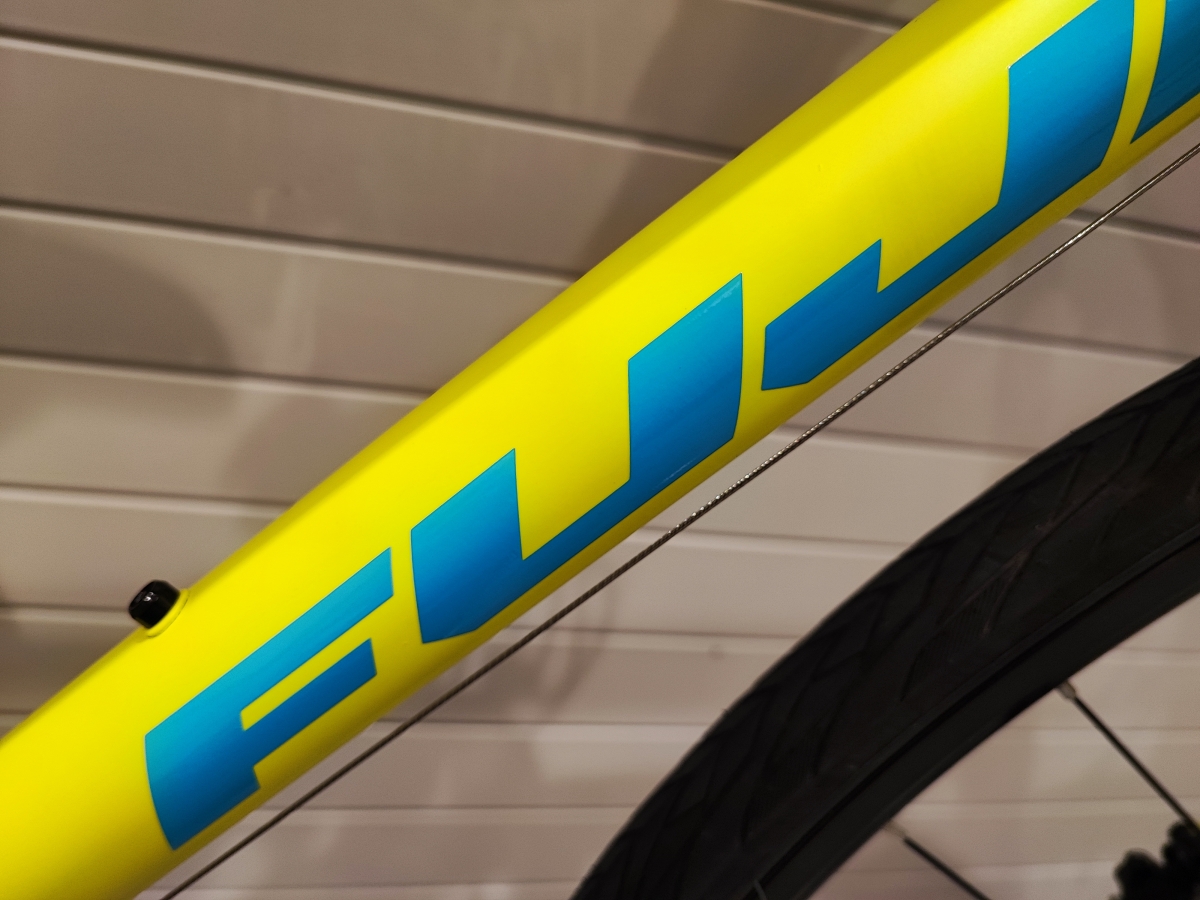 ネオンイエローの補色にあたるライトブルーのデカールもFUJIらしい色づかいで個性が光ります。