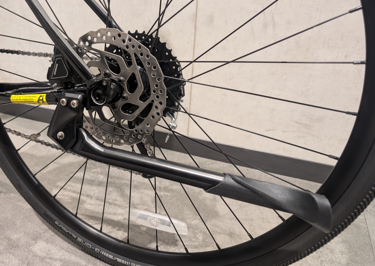 ドライブトレインはフロントチェーンリング38T、リヤスプロケット11-36Tのギヤ構成で、アシストと使用するギヤを組み合わせて効率よく走る事ができます。ブレーキはシマノのディスクブレーキが装備、タイヤサイズは700x35cが装着されています。ホイールはスルーアクスルがさいようされているので、固定がしっかりしているので剛性感は高いです。
