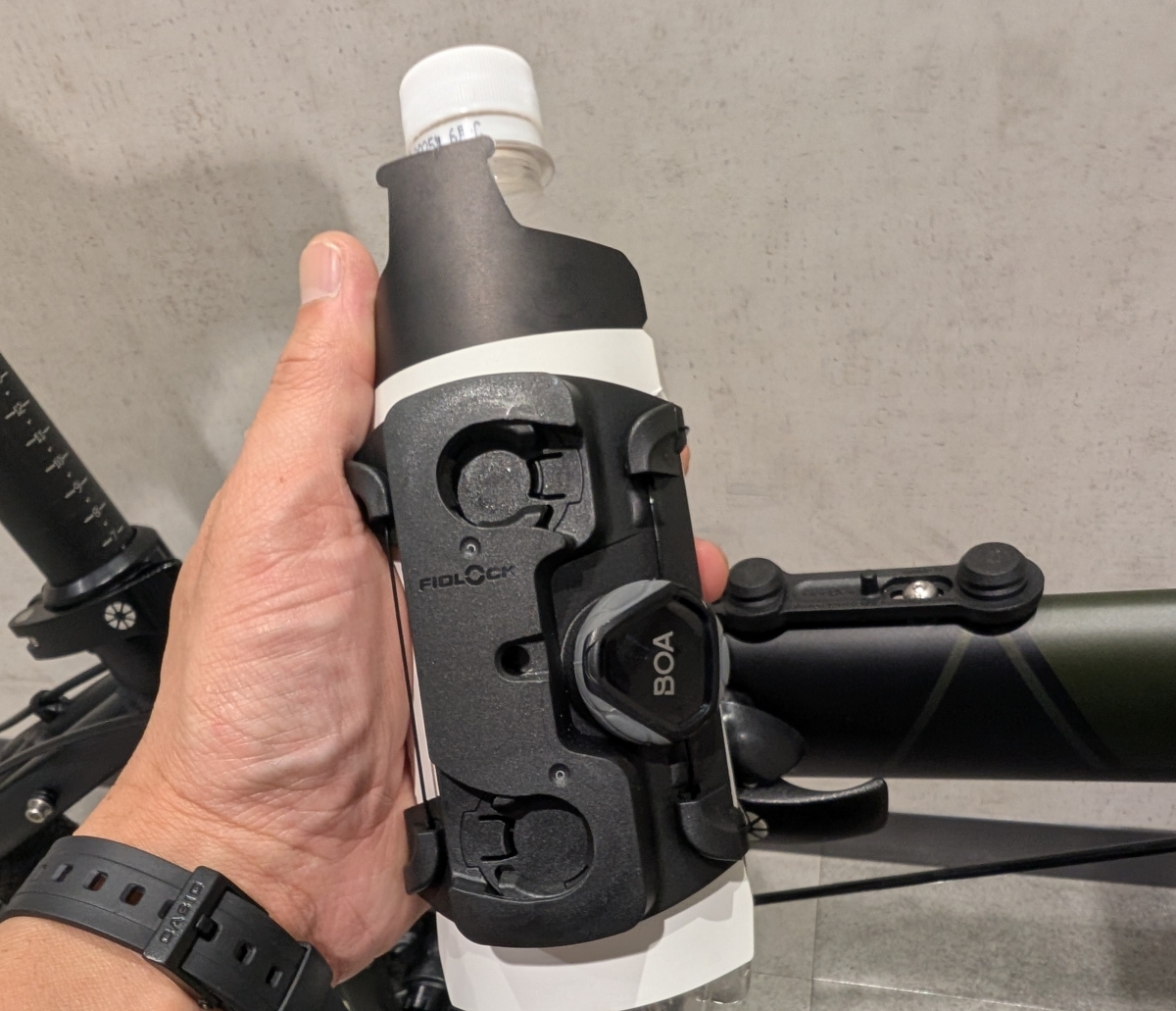 FIDLOCKの車体のボトル台座を使用するベースとコネクターのセットを装着。ベースとコネクターはマグネットでもしっかり保持され、コネクター部分はBOAでボトルやペットボトルをホールドしてくれるので、衝撃でドリンクが脱出してしまうのを防いでくれます。ダホン等の車体だとボトルケージがほぼ水平になるのでFIDLOCK TWIST UNI CONECTORシリーズだと安心感があります。ちなみにこちらは時計回りで外す右手用、反時計回りで外せるコネクターも別売り(\4,620(税込))でございます。