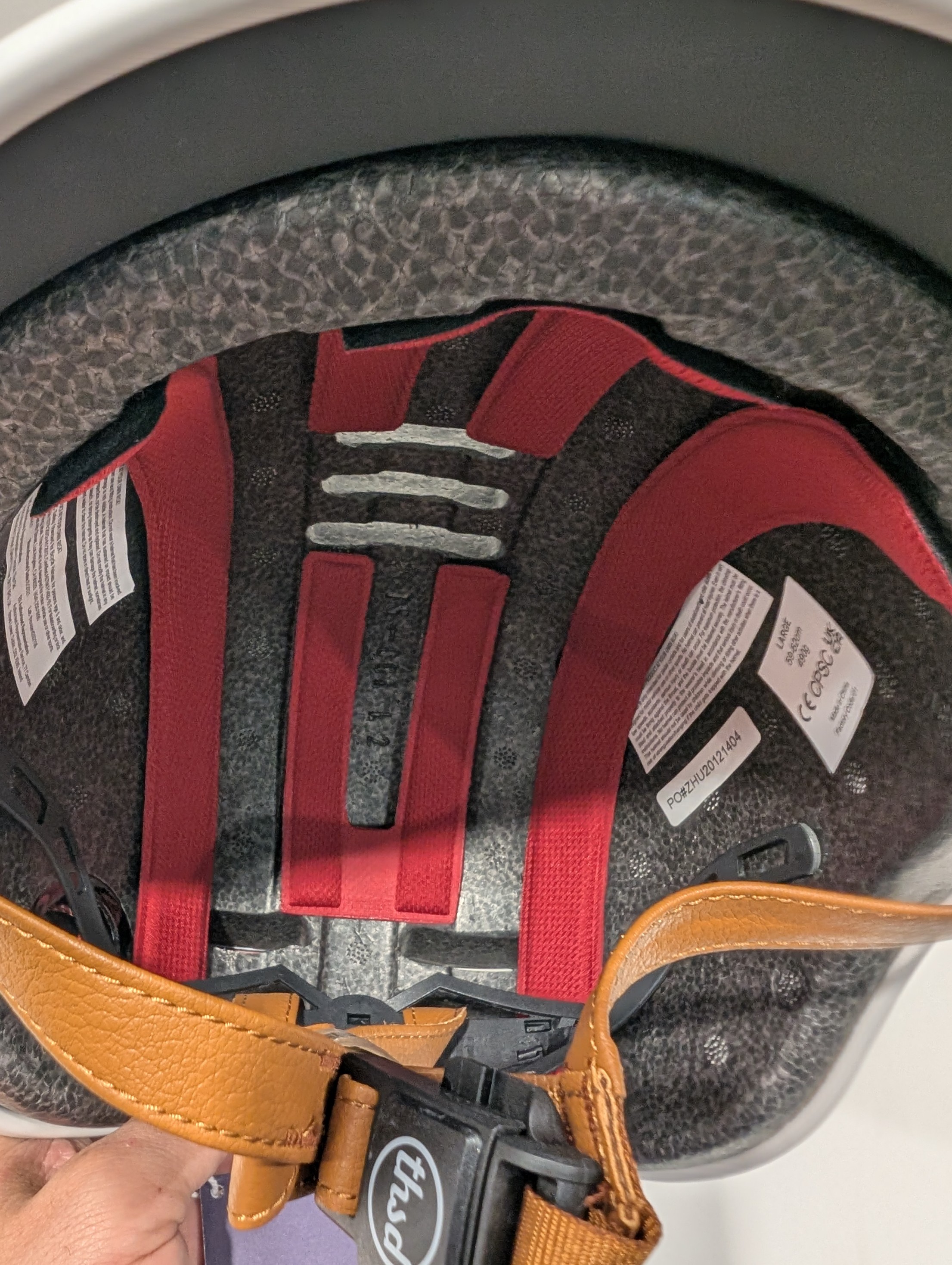 ヘルメットシェル内部はパッドが配置され、ホールド感の調整は後部の調整ダイヤルで行うのでしっかりと安定感のあるかぶり心地です。空気抜けの穴は頭頂部に3つ、後部に4つの全部で7つになります。2.0になる穴数と開口部が広くなりますが、暑い時期の長時間の使用でなければ問題ないでしょう。