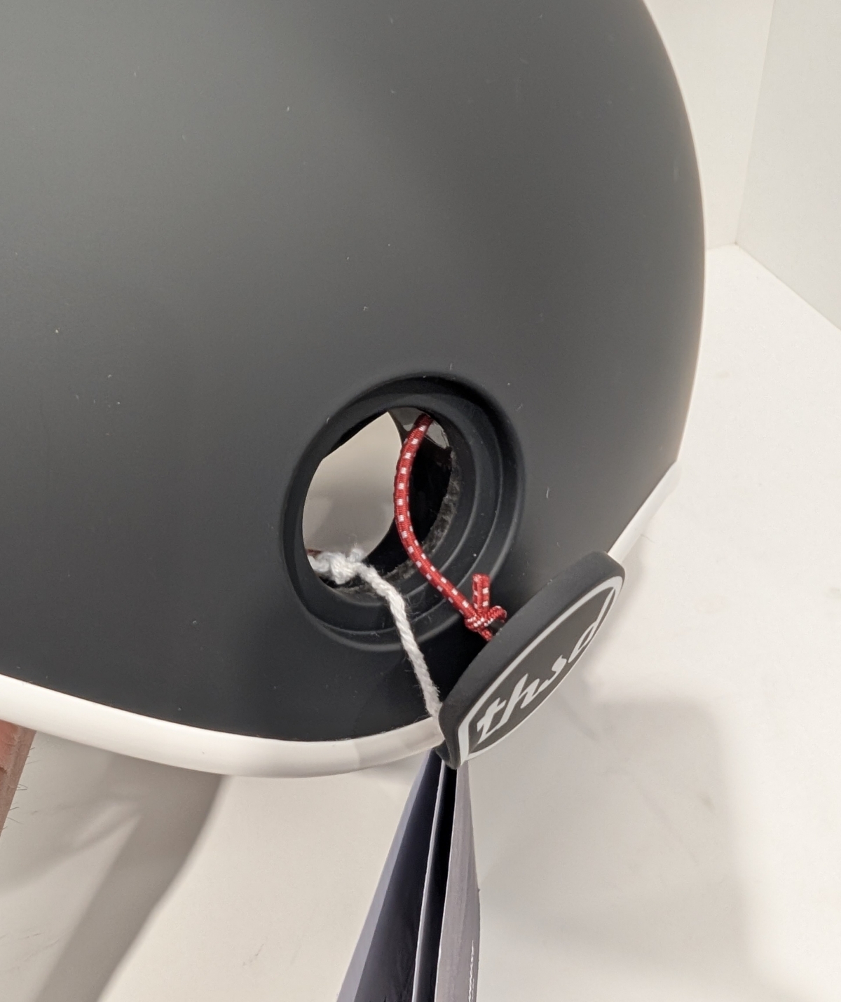 穴開いてます。こちらの穴はケーブルロックを通すもので、自転車への固定と盗難防止に役立ちます。白いひもはタグ用で、カバーの部分は赤いゴム紐でつながっています。本体とカバーはマグネットで固定しているので、走行中になくなる事はございません。