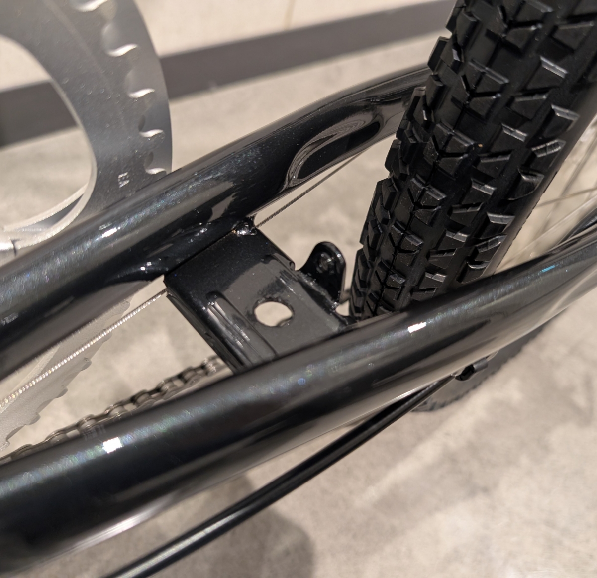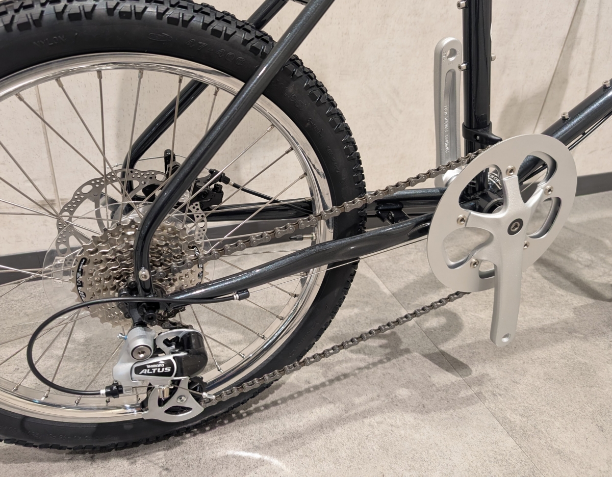 フロントチェーンリングはチェーンガード付きの48T、リヤスプロケットは11-32Tの8段変速です。軽めのギヤ構成なので、普段使いのノンビリとした巡航には使いやすいです!タイヤサイズは406規格の20×1.95と太めなタイプが装着されていますが、フレームのクリアランスに余裕があるので推奨最大サイズ20×2.4まで太くできます!