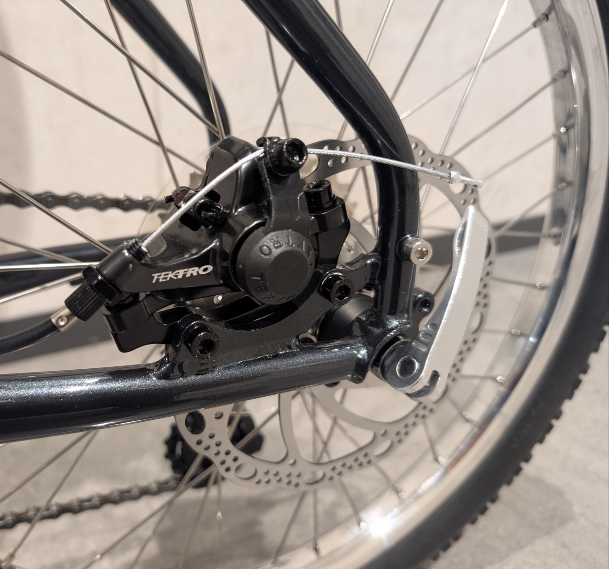 ブレーキはテクトロのワイヤー引きメカニカルディスクブレーキが採用されています。使っていて不満はないと思いますが、ブレーキ性能を上げたい場合は油圧ディスクブレーキに交換しても良いですね。ワイヤーで引くメカニカルディスクブレーキは握力を使うので、長い時間ブレーキを掛けていると下腕が結構疲れます…。