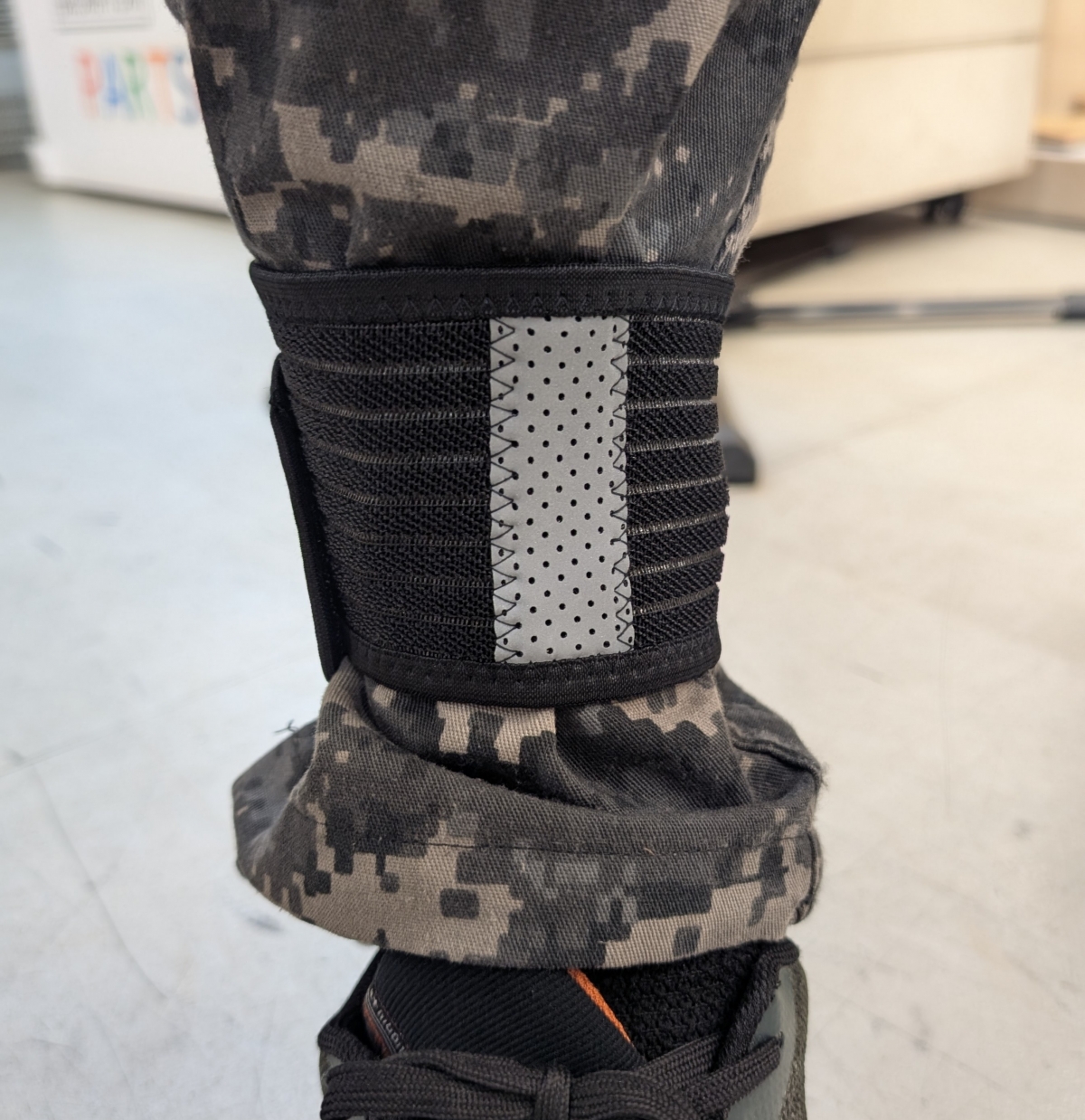 太いカーゴパンツの裾もしっかりフィット。伸縮性があるので巻き方を調整すれば反射素材は前と後ろにポジションします。注意点としては裾の巻き込みと汚れの対策アイテムであり、装着していても巻き込まない、汚れないと言う事ではございません。特にチェーンリングがない場合は白い系のズボンは避けた方が安全です。