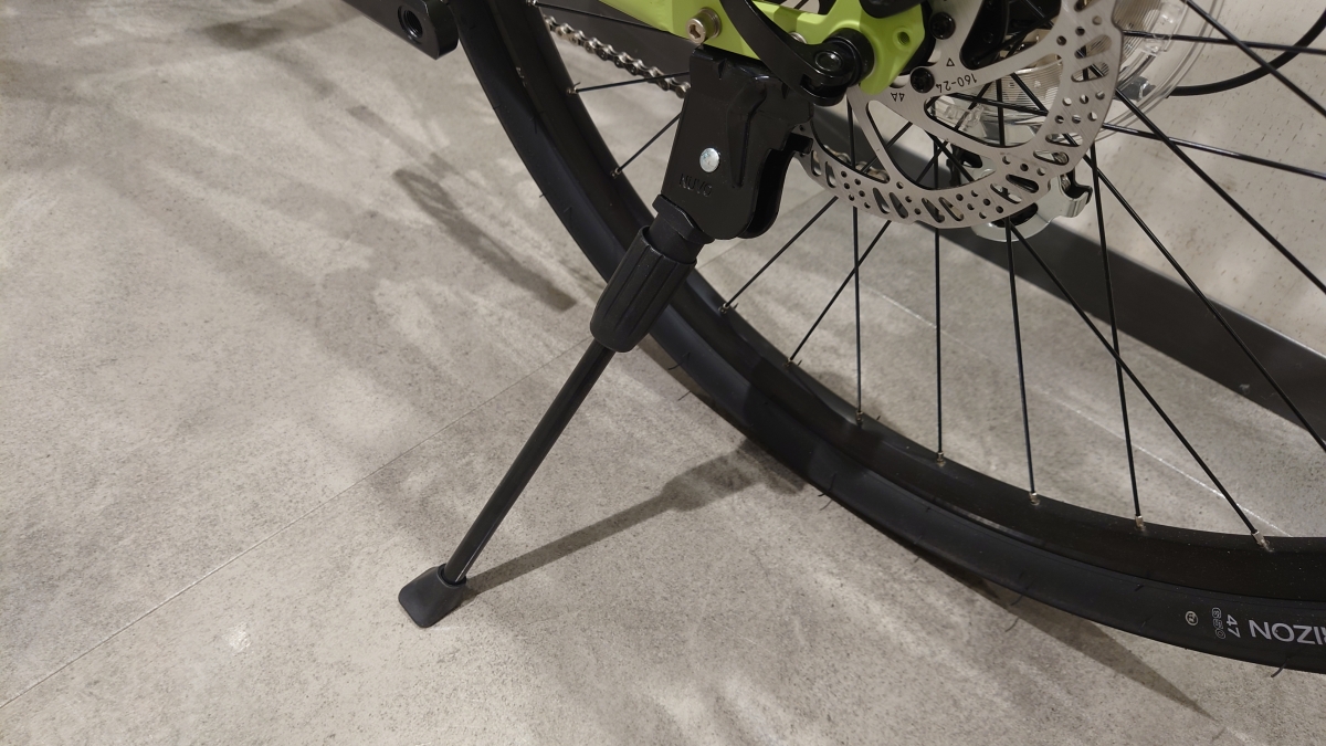 荷台と相性の良いセンタースタンドは取付が難しい形状のフレームなので、純正スタンドと同じKSA40規格を採用しつつも耐荷重の大きいスタンド(ATRAN VELO レックスHVなどE-BIKE対応の物)への交換がオススメ