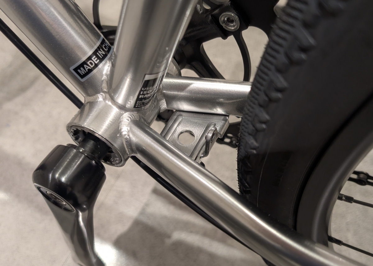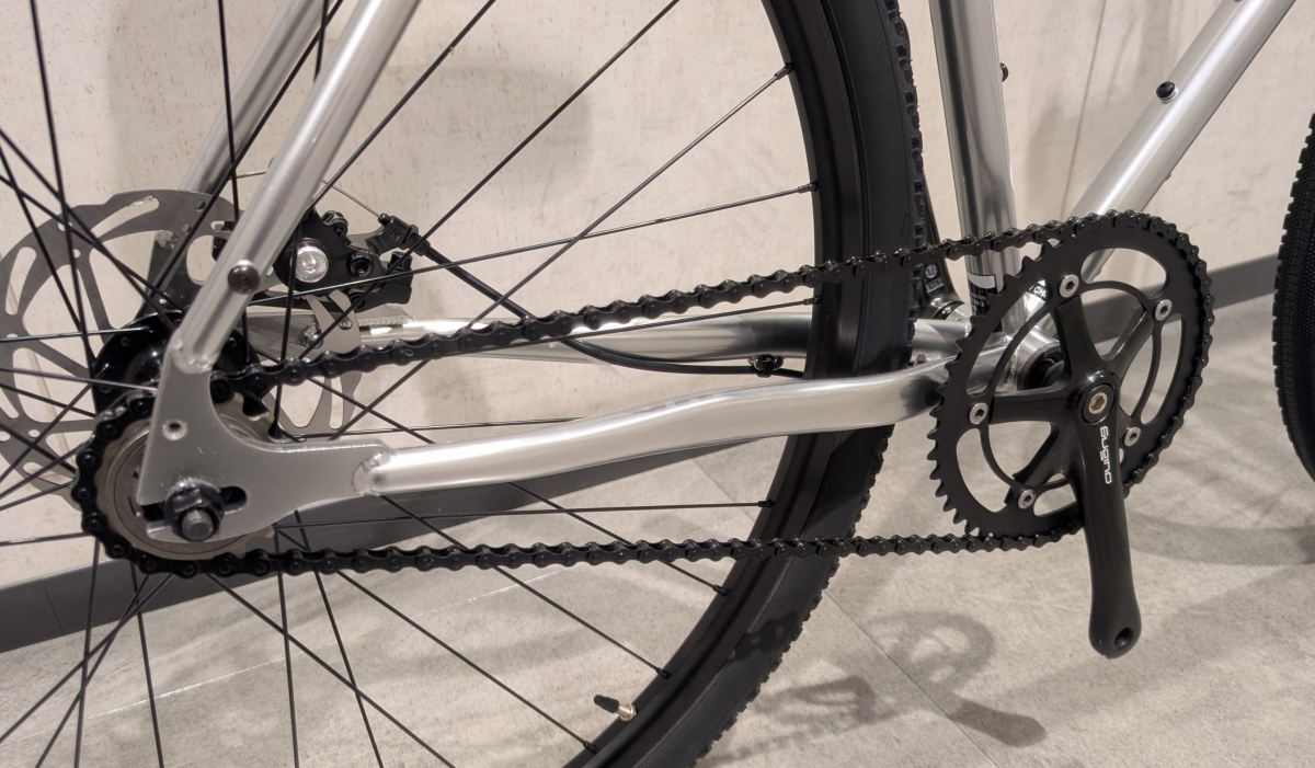 ギヤはフロント46Tのリヤ17Tで、同じFUJIのシングルスピードのFEATHERより軽く、STROLLより重いギヤ比になっています。タイヤサイズは700x38cが装着されています。フレームクリアランスが広めなので最大で45c までのタイヤに対応しています。