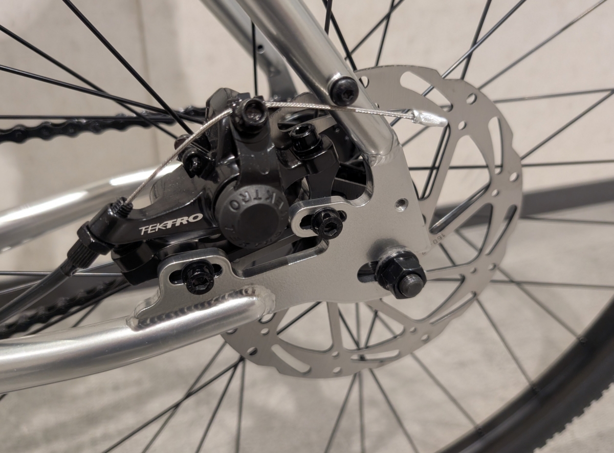 ブレーキはワイヤーで引く機械式ディスクブレーキです。油圧式と比較して効きが弱く感じたら油圧式に交換しても良いですね!ブレーキは大事です!