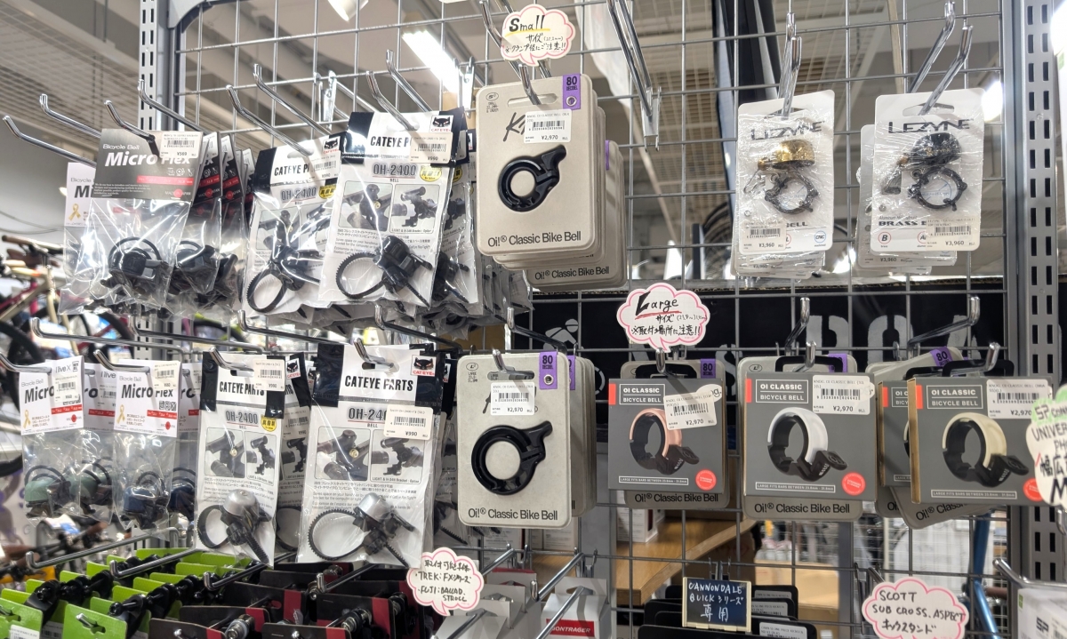 新宿クロスバイク館に入ってすぐ左、5mくらいにオプションコーナーがございます。ライトやキックスタンドの他、カギやフェンダーなども在庫しております。ご購入時に是非ご覧になってみて下さい!
