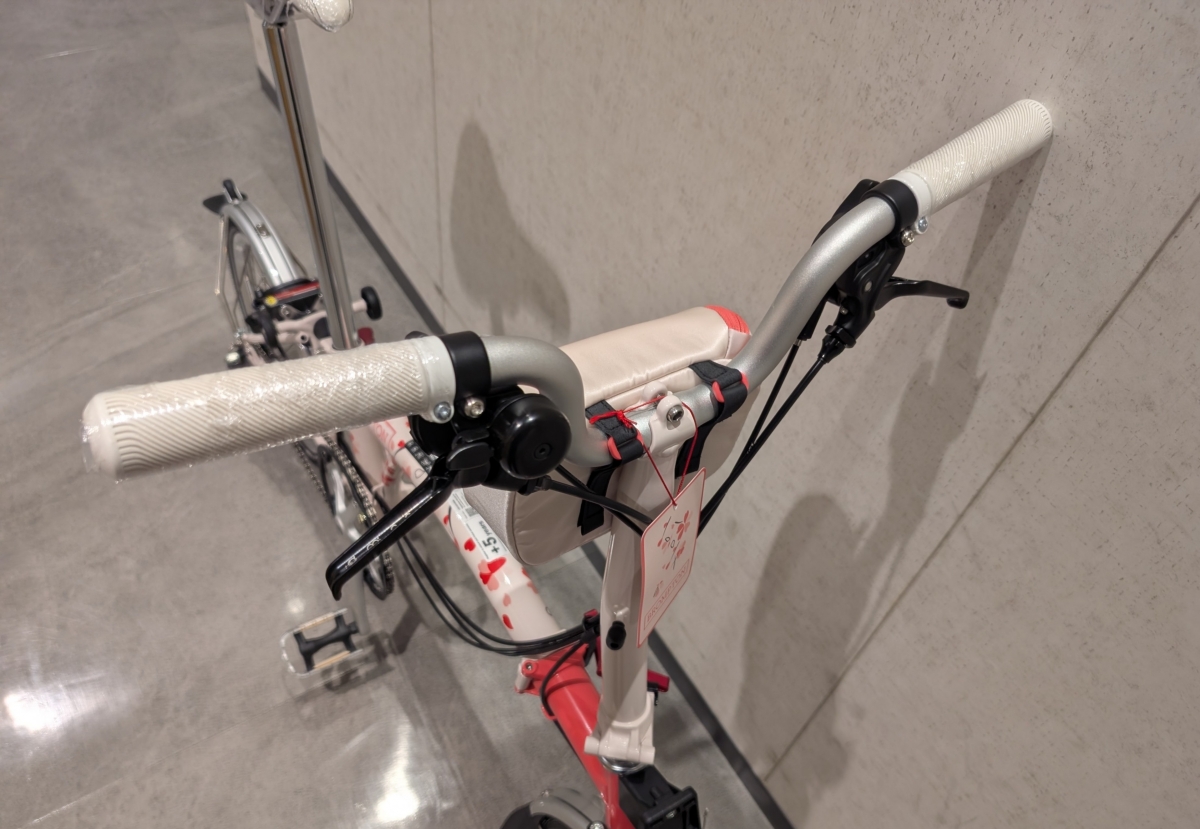 M6Lの車種名のとおりMタイプハンドルです。グリップやステムのカラーの違いはありますが、ハンドルやレバー類は通常の車体と同様のパーツで構成されています。ハンドル中央部分にあるのは付属のポーチになります。前回の限定チェリーブロッサムではポーチと大きめのバッグでしたが、今回はポーチだけとなっています。ですが、今回はヒンジ部分のレバー等にアルミのカラーパーツが使われており、見劣りする事はございません!