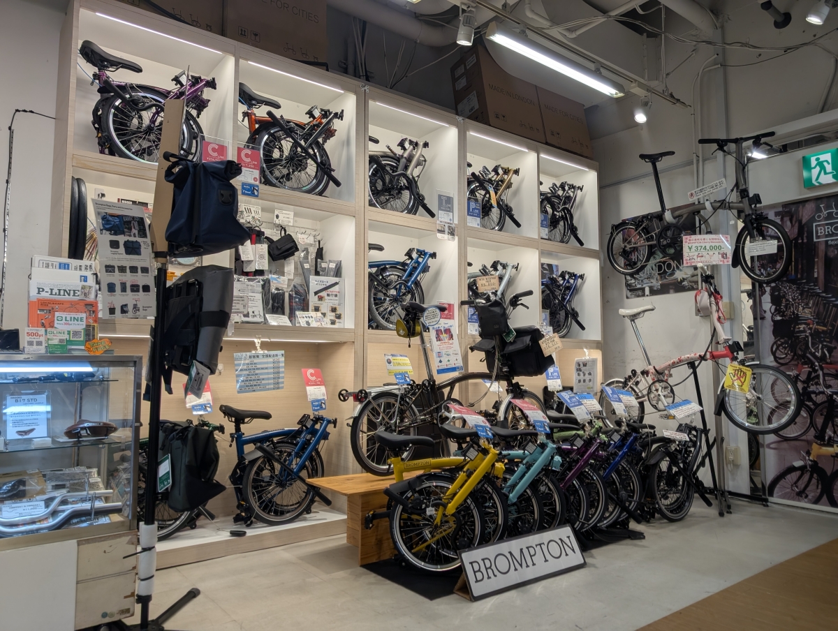 新宿クロスバイク館に入ってすぐ右側がブロンプトンコーナーとなっております!C-LINEはもちろん、P-LINEやT-LINEも在庫しております。また、ブロンプトン用のバッグやアップグレードパーツ等もございますので是非ご覧になってみてください!受注時にパーツを選んで、パーツを交換してのご納車も承っております。