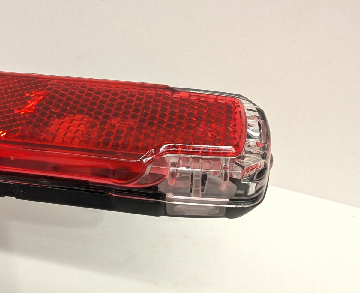 本体にリフレクターの機能とLEDによる発光で安心の性能を持つリヤライトです。本体の左右に帯状の高出力LEDを均一に発光させるラインテックを採用しており、左右の縁をコの字型に発光させる事により、後方と横からの視認性に優れています。