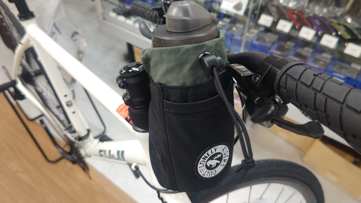 実際に店頭にある自転車に取り付けてみました。サイズ感としては500mlのペットボトルは余裕で入るサイズ感。今回はFIDLOCKの590mlボトルを入れていますが、まったく問題なさそうです。