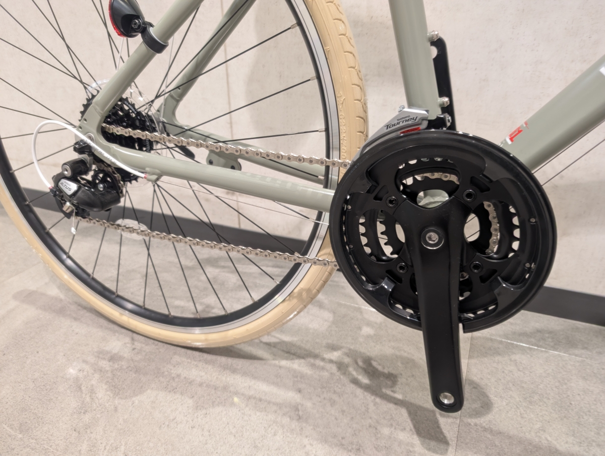 フロントチェーンリングはチェーンガード付きで48-38-28Tの3段、リヤスプロケットは11-32Tの8段、全24段変速です。重たいギヤからいギヤまで幅広い範囲をカバーしているので使いやすいギヤの組み合わせになっています。ブレーキ本体はVブレーキで、タイヤサイズは700x32cとスタンダードな太さです。