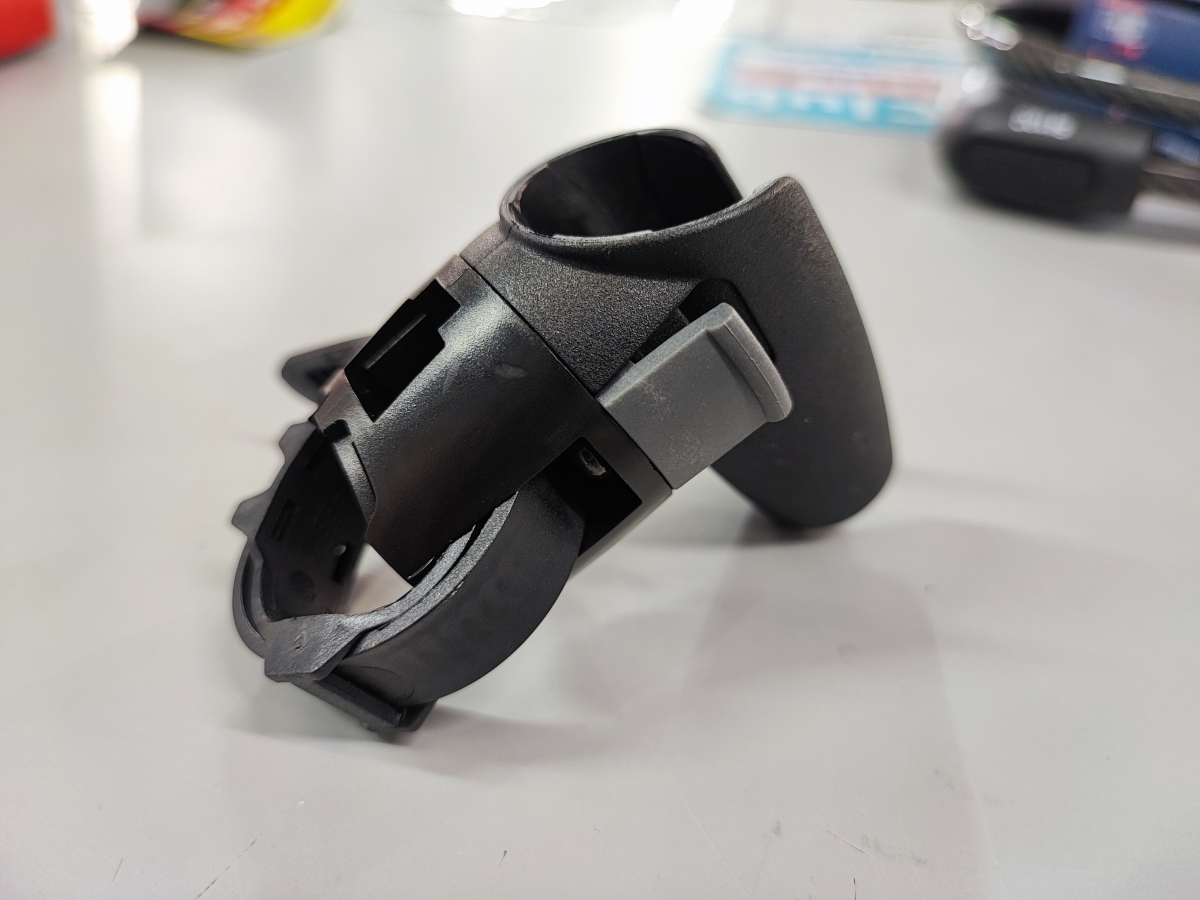 これが車体に取付するためのアダプターです。ロックを上から差し込んで固定、外す際は左右にあるグレーの部分を摘むようにするとロックが外れて引き抜くことができます。