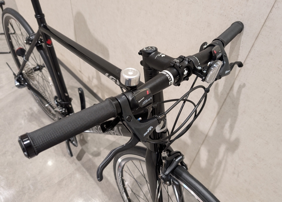 ハンドルはスタンダードなストレートタイプで、グリップはしっかり握りやすい丸型形状のロックオングリップです。ブレーキレバーとシフトレバーはシマノのソラで揃えられています。
