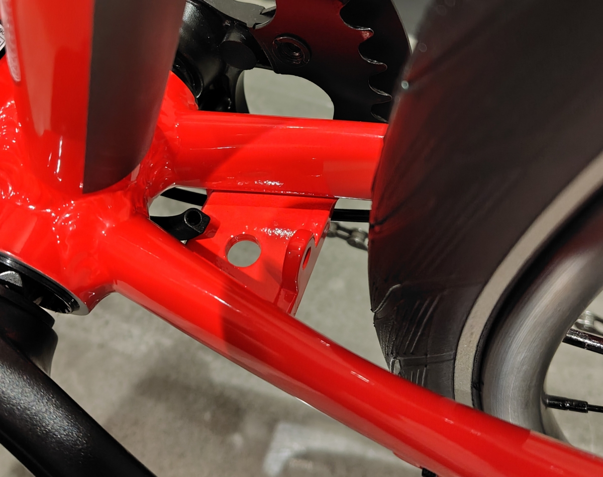 ラリーレッドのフレームにペイントされたロゴなどは光を反射してくれるので、前後左右のどこからでも光が当たれば自転車の存在を認識させてくれます。当然ですが、暗くなったらライトは点けましょうね!