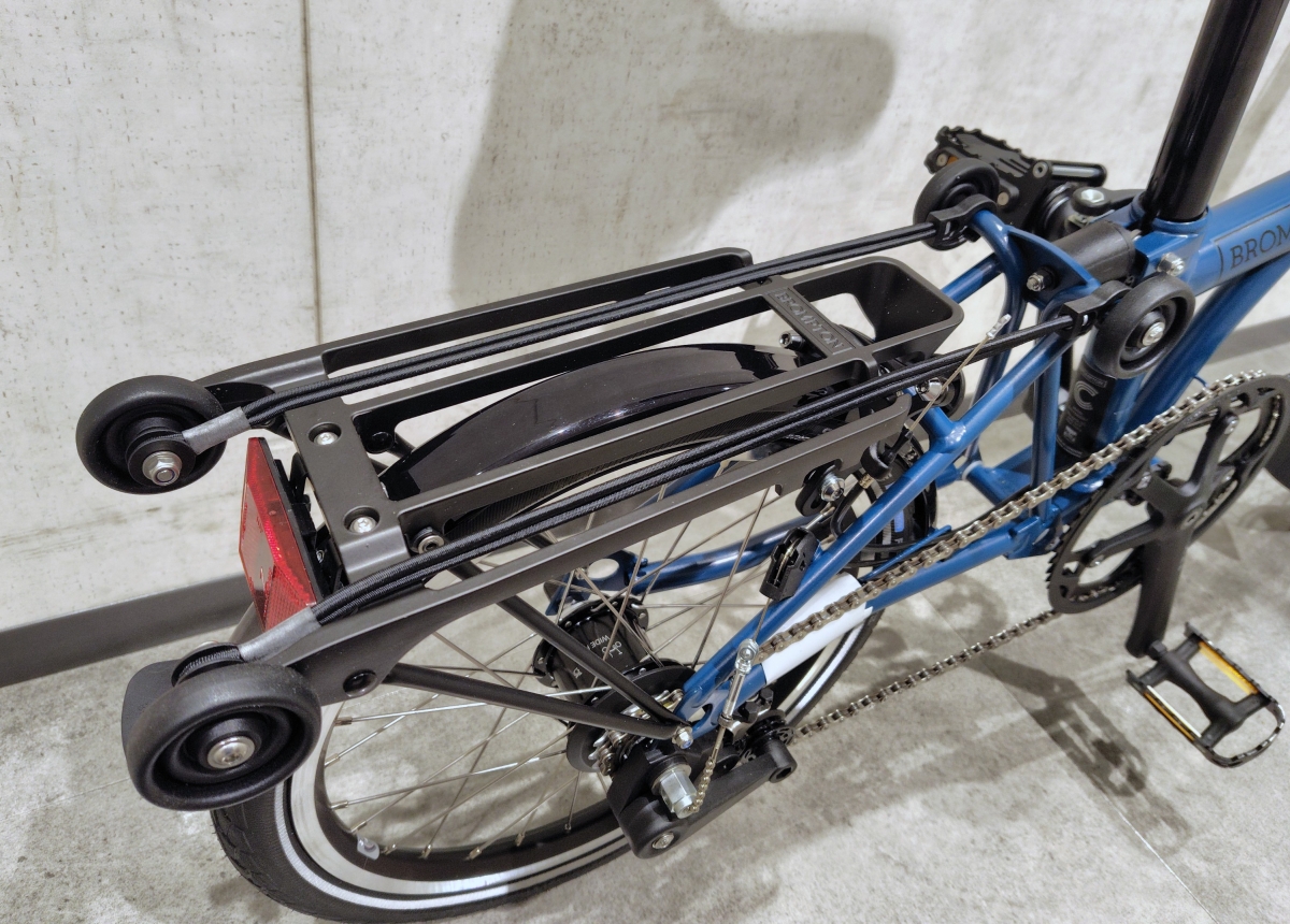 S6Rの「R」はラックの「R」、畳んだ時により安定感があります。ラック付きだとローラーも4つになるので折り畳んで転がす時に安心感もあります。BROMPTONのリヤ反射板は別売りのリヤライトに換装も出来るので、夜間走行もされる方はご相談ください!