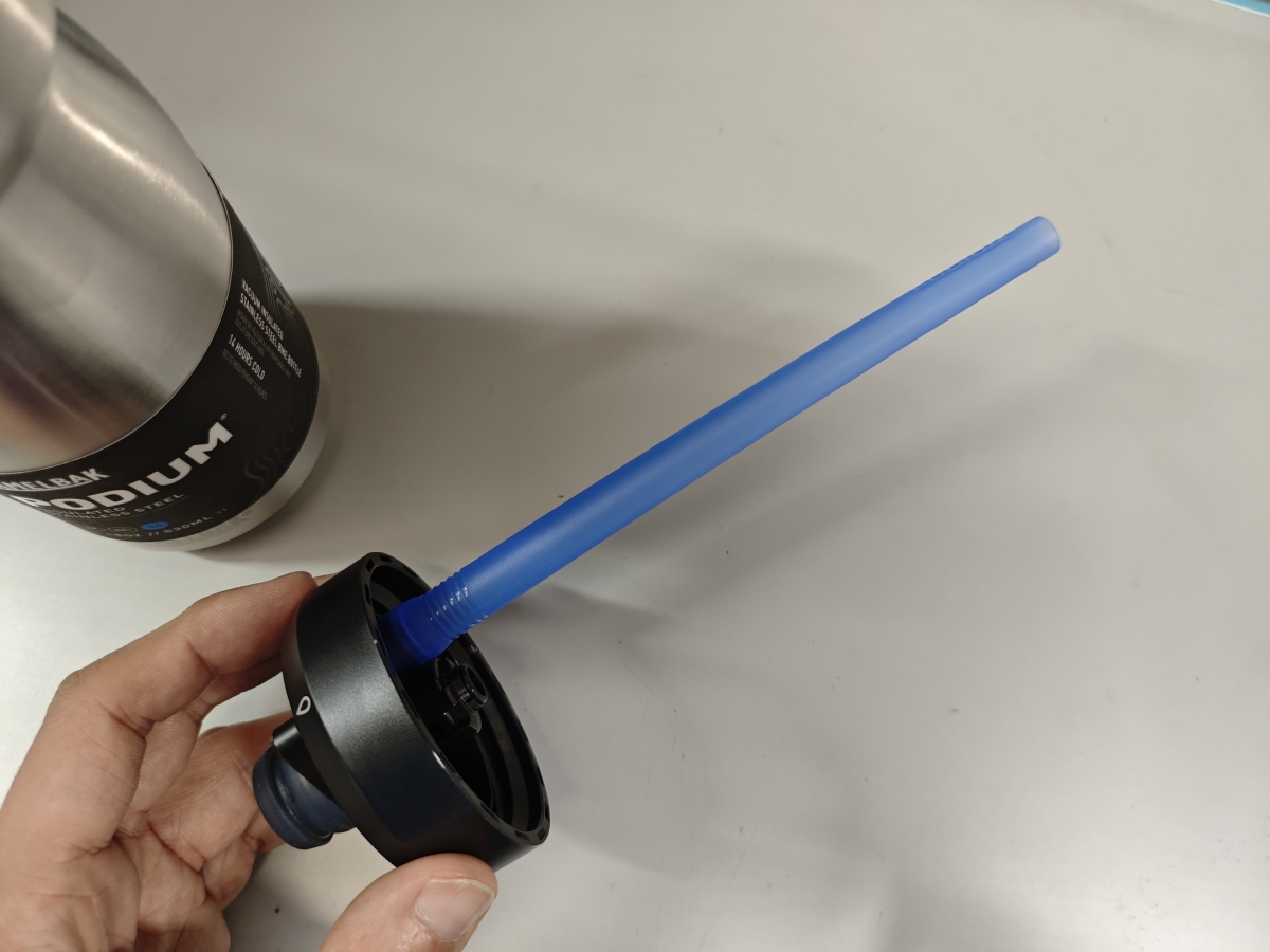 このストローみたいなのは空気穴で、傾けて口から吸うとそこから空気がボトル内に入り負圧が発生せずにスムーズに水を排出してくれます。見た目だけでなく、ちゃんとスポーツボトルな使い方ができる点もいいところですね!