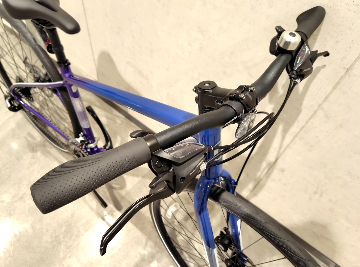 ハンドルは640mm幅で25mmライズしてます。ステムは8度の角度付きのショートステムなのでハンドル部分を見るとMTBのような印象です。グリップは手のひらに優しいエルゴタイプ、レバーはShimanoの変速とブレーキのレバーが一体型のタイプが採用されています。