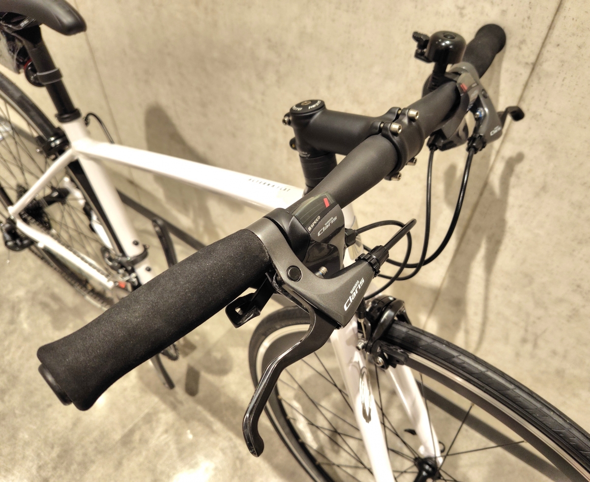 ハンドルは全サイズ共通580mm幅のストレートタイプです。グリップはソフトなスポンジグリップが採用されています。ブレーキレバー、変速レバーともシマノのロードバイクコンポーネントのクラリスを搭載しています。変速はラピッドファイヤ―プラスなのでリリースレバーが2WAY、つまりワイヤーを緩める方のレバーは人差し指と親指のどちらでも操作が可能です。シマノ製なのでレバータッチはどちらもカチッとした剛性感があります。ヘッドチューブは上下異形のテーパータイプなのでハンドル周りの剛性は高くて安心感があります!