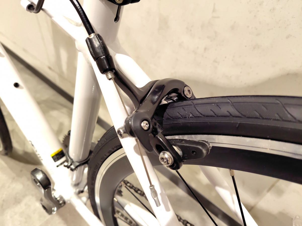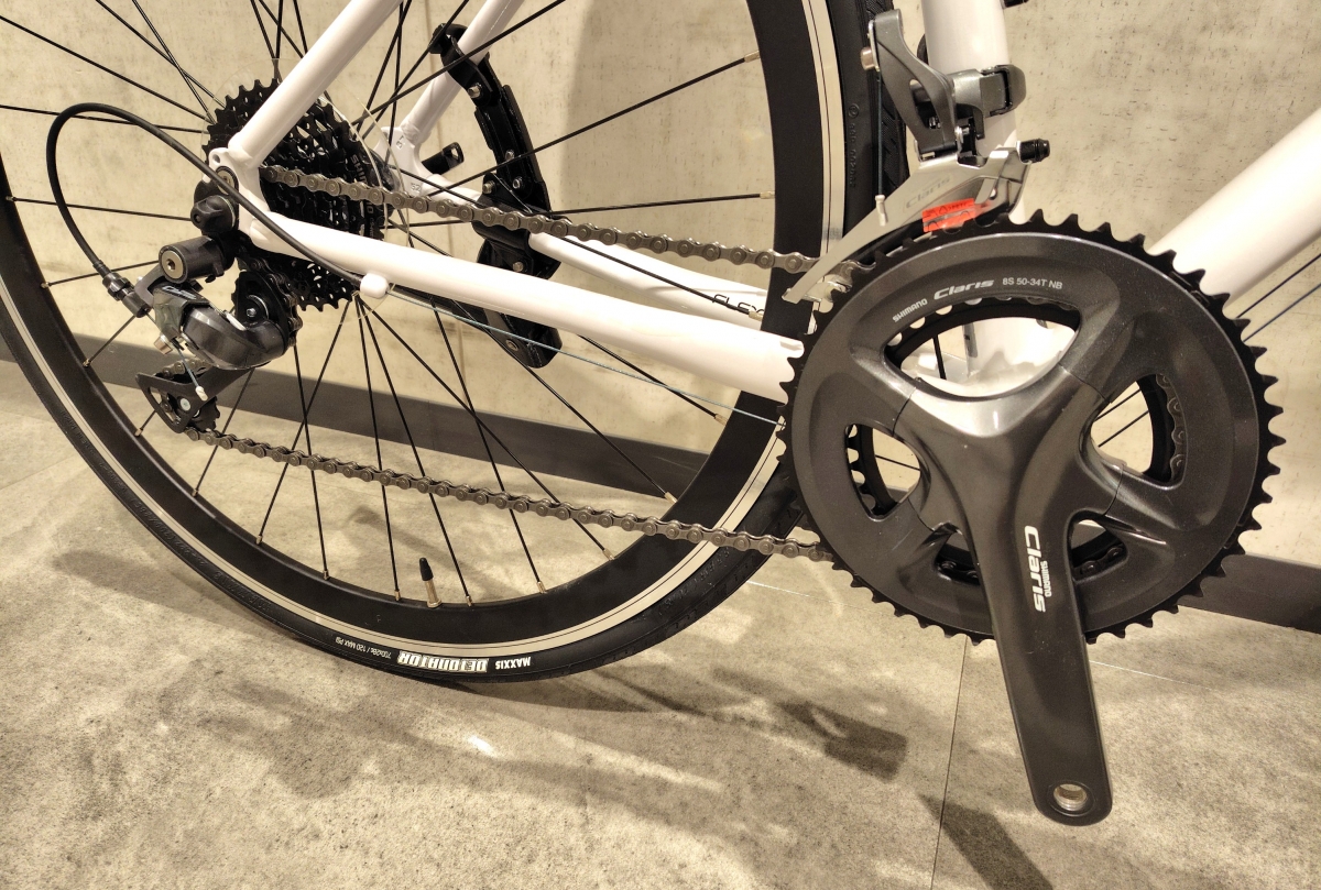 クランク、FD、RDはシマノのクラリスを搭載。チェーンリングは50x34Tのダブル、スプロケットは11-32Tの8速、全16段変速です。ワイドなギヤ構成なのでオールラウンドに使いやすいですね。クランクは2ピースクランクなので剛性があり、ペダルを踏んだ力がしっかり推進力に変換されていくのがわかるかと思います!タイヤサイズは700x28cと細めです。