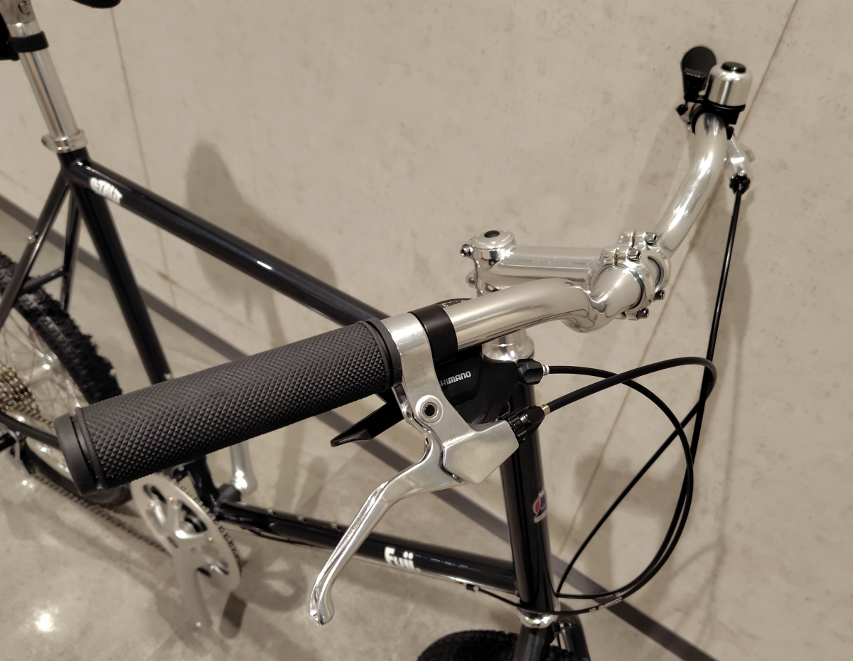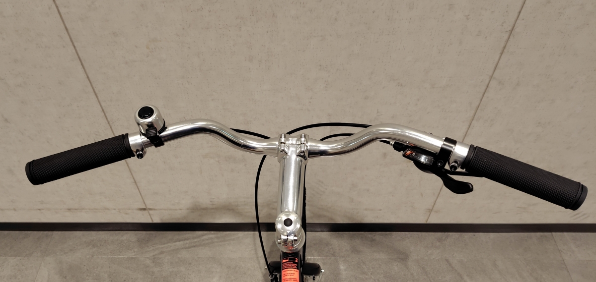 ハンドルはアップライズしたプロムナードタイプで、ハンドル幅はグリップの端から端で実測660mmと幅広です。ステムも上向きなので楽な乗車ポジションがとれます。グリップはスタンダードなラバーの丸型形状で、ブレーキレバーはアルミ製の2フィンガータイプ、変速レバーはシマノのラピッドファイヤーが採用されています。