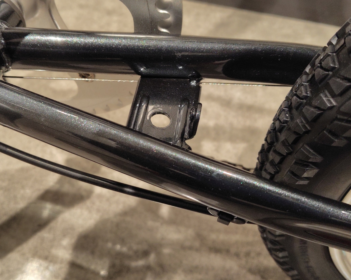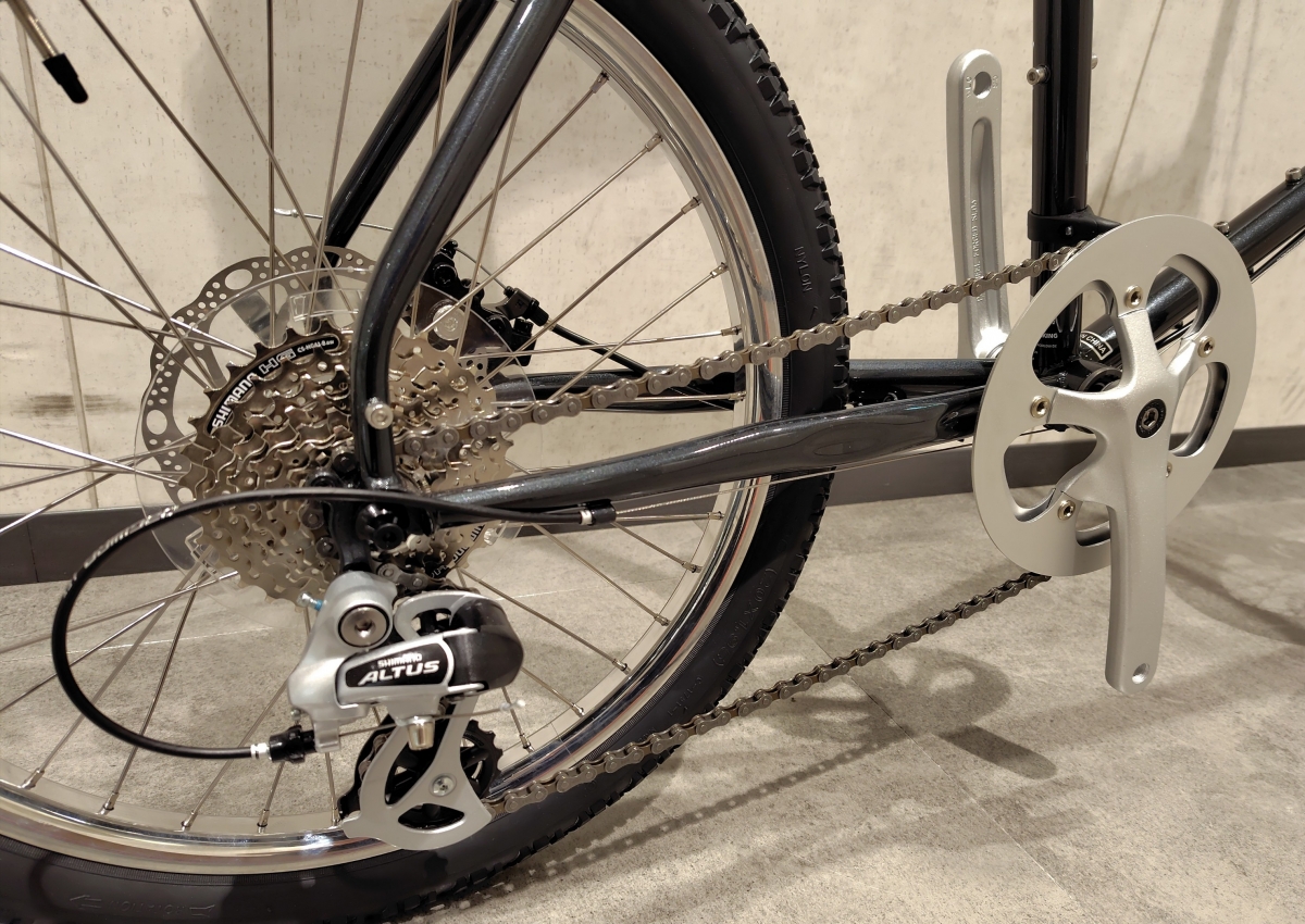 フロントチェーンリングはチェーンガード付きの48T、リヤスプロケットは11-32Tの8段変速です。軽めのギヤ構成なのでトップスピードは抑え気味になりますが、普段使いのノンビリとしたクルージングには向いていますね。タイヤは406規格の20×1.95の太めなブロックパターンのタイプが装着されています。フレームのクリアランスに余裕があるので推奨最大サイズだと20×2.4まで太くできます!タイヤを交換する時に太くしたり、スリックパターンのタイヤにしても面白いかもしれません。