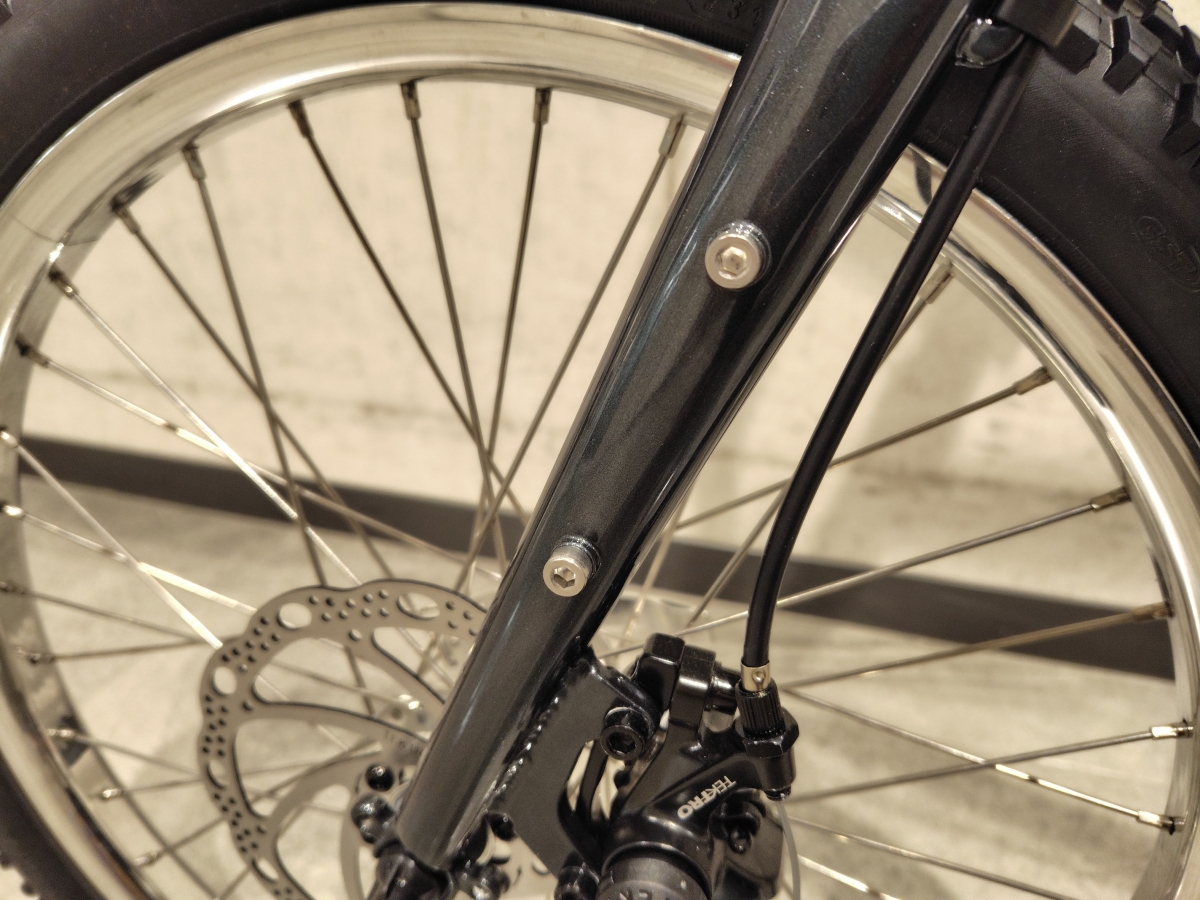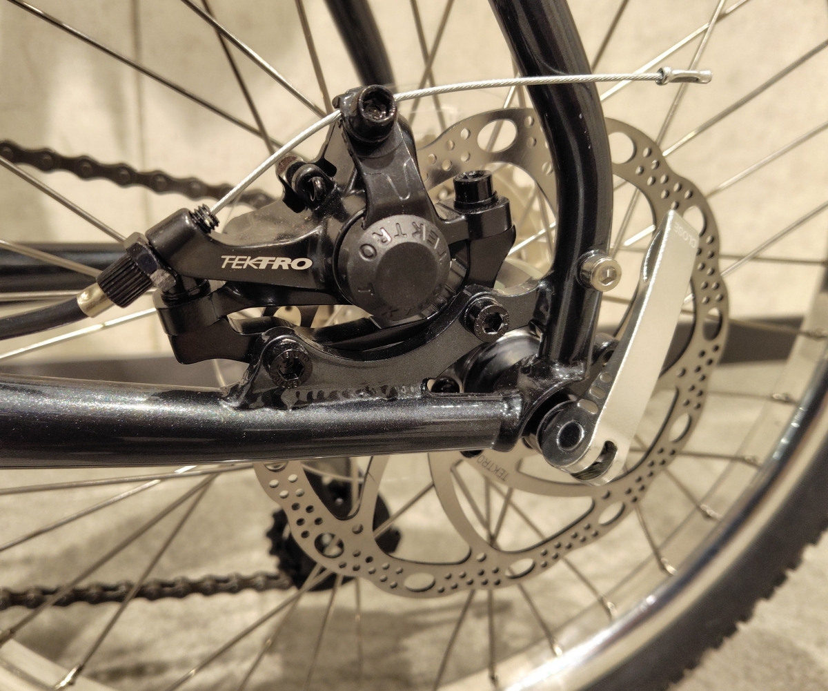 ブレーキはテクトロのワイヤー引きメカニカルディスクブレーキが搭載されています。日常づかいで不満はないと思いますが、制動性能を上げたい場合は油圧ディスクブレーキに換装しても良いかもしれませんね。以前MTBでメカニカルディスクブレーキを使用していた時、ブレーキを油圧ディスクブレーキに換装してコースを走ったら腕の疲れ方が全然違いました。軽いタッチで効きの良い油圧ディスクブレーキは天候や路面を問わず楽で良いですよ!