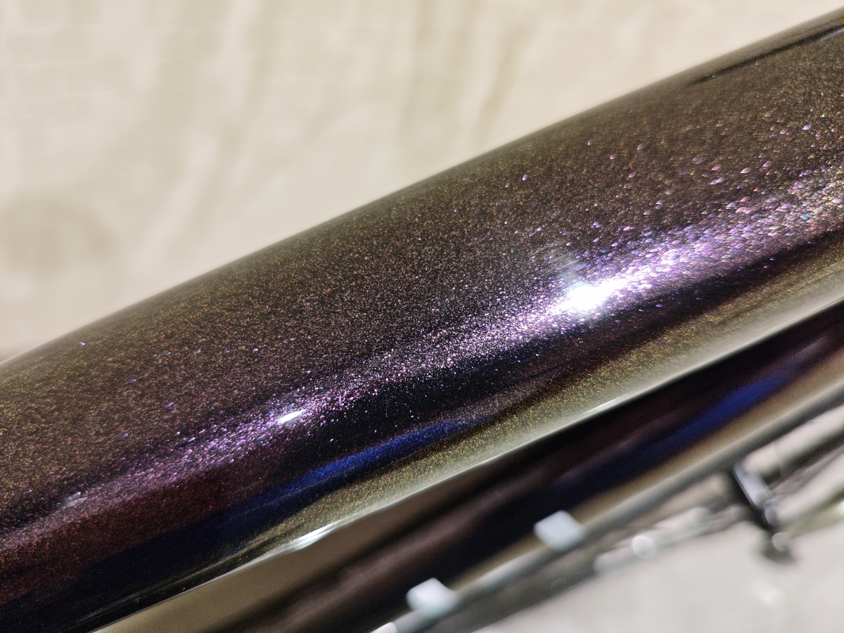 直訳でニジマス。ギラッギラのカメレオンカラーです。グリッターモリモリのパープル→ゴールドな偏光塗料です。表面は光沢仕上げで、グリッターの輝きを活かした仕様ですね。